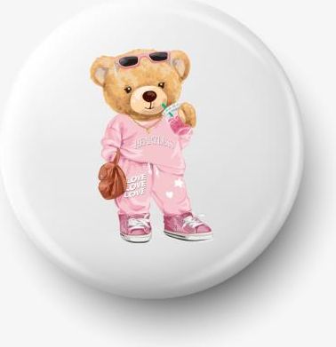 Button z wizerunkiem słodkiej dziewczyny miś w różowym outficie.