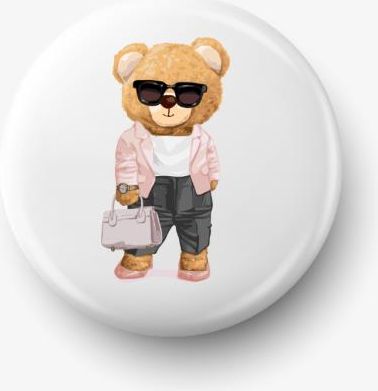 Button z wizerunkiem słodkiej dziewczyny miś w różowym outficie.