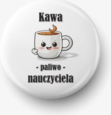 Zabawny button dla nauczyciela - kawosza, który będzie mógł towarzyszyć mu jako element stroju lub dodatek na torebce czy plecaku.