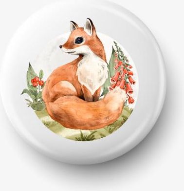 Przypinka z obrazkiem uroczego liska na tle roślinności.