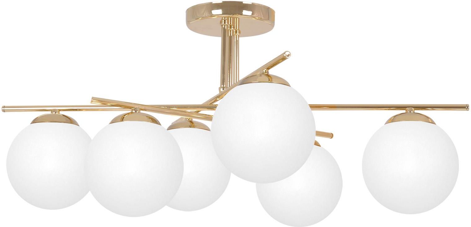 Duża, złota lampa sufitowa z białymi kloszami w kształcie kul Postaw na detal, który upiększy wnętrze Lampa sufitowa Rea to doskonały wybór, jeśli szukasz wyjątkowego elementu oświetlenia, który odmieni Twoje wnętrze i nada mu niepowtarzalnego charakteru. Wyobraź sobie subtelne, ciepłe światło …