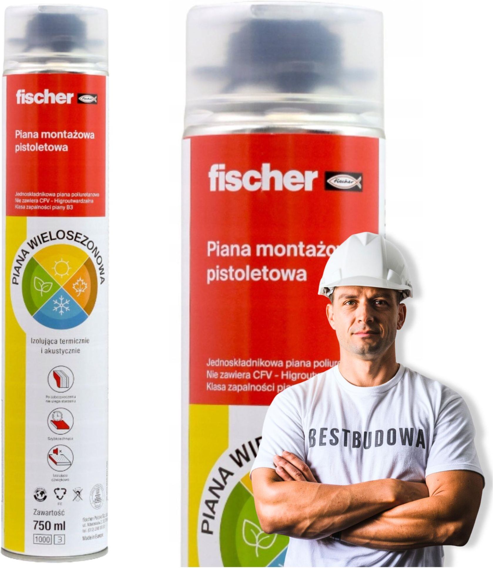 Fischer piana pistoletowa pianka PPOŻ Ognioodporna Ogniowa B1 Ognioodporna piana pistoletowa fischer PUP B1 750 oferuje wysoką odporność na ogień zgodnie z klasą materiału budowlanego B1 wg DIN 4102-1. Dzięki temu nadaje się ona do wypełniania i uszczelniania spoin z wymaganiami w zakresie ognioodporności. Dodatkowo, piana nadaje się do wysokoefektywnych termoizolacji elewacyjnych z wyprawą (ETICS). Piana jest również używana do mocowania i uszczelniania na powierzchni dachów i ścian oraz uszczelniania spoin okiennych. Łatwe dozowanie umożliwia kontrolę wypełniania i izolowania oraz obniżanie kosztów. Szary dozownik fischer PUP 750 B posiada solidny zawór, który zapewnia maksymalne zabezpieczenie przed zatorami i utratą gazu. W zestawie znajdują się rękawice ochronne dla użytkownika. Max. wydajność piany ( przy swobodnym rozprężaniu ) do 45 l. 1-składnikowa piana poliuretanowa. Środowisko termiczne obróbki: +10 °C do +25 °C (temperatura puszki: +10 °C do +25 °C). Suchość dotykowa po ok. 10 minutach. Możliwość cięcia po upływie ok. 40 minut. Utwardzanie po upływie 5 do 8 godz. Odporność na temperatury od -40 °C do +90 °C. Grubość warstwy 50 mm: piankować w kilku warstwach, następnie zwilżyć. Zanieczyszczenia świeżą pianką można natychmiast usuwać środkiem do czyszczenia pianki PU. Ognioodporna piana pistoletowa fischer PUP B1 750 oferuje wysoką odporność na ogień zgodnie z klasą materiału budowlanego B1 wg DIN 4102-1. Dzięki temu nadaje się ona do wypełniania i uszczelniania spoin z wymaganiami w zakresie ognioodporności. Dodatkowo, piana nadaje się do wysokoefektywnych termoizolacji elewacyjnych z wyprawą (ETICS). Piana jest również używana do mocowania i uszczelniania na powierzchni dachów i ścian oraz uszczelniania spoin okiennych. Łatwe dozowanie umożliwia kontrolę wypełniania i izolowania oraz obniżanie kosztów. Szary dozownik fischer PUP 750 B posiada solidny zawór, który zapewnia maksymalne zabezpieczenie przed zatorami i utratą gazu. W zestawie znajdują się rękawice ochronne dla użytkownika. Max. wydajność piany ( przy swobodnym rozprężaniu ) do 45 l. 1-składnikowa piana poliuretanowa. Środowisko termiczne obróbki: +10 °C do +25 °C (temperatura puszki: +10 °C do +25 °C). Suchość dotykowa po ok. 10 minutach. Możliwość cięcia po upływie ok. 40 minut. Utwardzanie po upływie 5 do 8 godz. Odporność na temperatury od -40 °C do +90 °C. Grubość warstwy 50 mm: piankować w kilku warstwach, następnie zwilżyć. Zanieczyszczenia świeżą pianką można natychmiast usuwać środkiem do czyszczenia pianki PU.