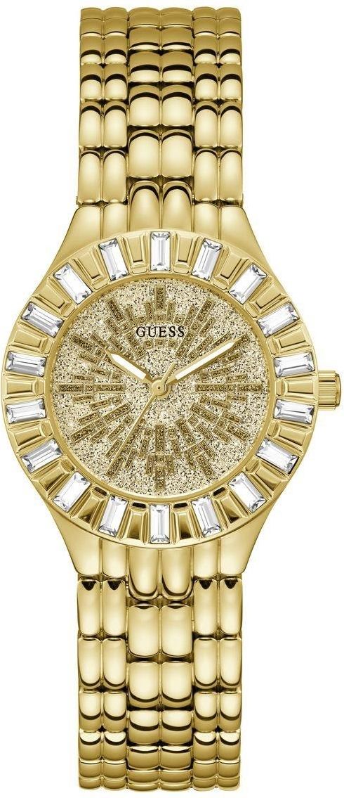 Guess GW0602L2 Zegarek Guess GW0602L2 z kolekcji Firework to doskonałe połączenie elegancji, funkcjonalności oraz modnych detali. Stylowe akcesorium, które podkreśli Twój indywidualny styl, sprawi, że każdy dzień stanie się wyjątkowy. Dzięki temu modelowi zyskasz elegancki dodatek, który idealnie dopełni każdą stylizację, niezależnie od okazji. Typ zegarka Model GW0602L2 to damski zegarek analogowy, który łączy w sobie modne elementy z funkcjonalnością. Czasomierze tego typu są często wybierane przez osoby ceniące sobie elegancję oraz klasyczne wzornictwo. Dzięki swojemu ponadczasowemu charakterowi, zegarek Guess stanie się idealnym wyborem dla kobiet, które pragną wzbogacić swoją kolekcję o wyjątkowy dodatek. Mechanizm Precyzyjny mechanizm kwarcowy napędza ten model, co zapewnia wyjątkową dokładność oraz niezawodność. Mechanizmy kwarcowe są cenione za swoją trwałość i łatwość w serwisowaniu. Zegarek damski zasilany jest baterią, co eliminuje potrzebę regularnego nawijania, a codzienne użytkowanie staje się komfortowe i bezproblemowe. Materiał koperty Koperta zegarka wykonana jest z wysokiej jakości stali nierdzewnej w eleganckim złotym kolorze. Ten materiał gwarantuje trwałość i wytrzymałość, a jednocześnie nadaje klasyczny wygląd. Złota koperta harmonijnie współgra z pozostałymi elementami, tworząc spójną i elegancką całość. Polerowana powierzchnia sprawia, że czasomierz prezentuje się wyjątkowo, przyciągając wzrok i dodając szyku każdej stylizacji. Szkiełko W modelu zastosowano utwardzane szkło mineralne, które jest odporne na zarysowania, co znacząco wpływa na jego długowieczność oraz estetykę. Dzięki wysokiej przejrzystości szkła, tarcza zegarka pozostaje zawsze czytelna, a błyszczące elementy doskonale odbijają światło. Użytkownicy z pewnością docenią, że zegarek będzie zachowywał swój atrakcyjny wygląd przez długi czas, nawet przy codziennym użytkowaniu. Styl i design Zegarek Guess wyróżnia się klasycznym stylem, który idealnie wpisuje się w aktualne trendy. Złota tarcza, ozdobiona delikatnymi kryształowymi kamieniami, nadaje mu wyjątkowej elegancji. Eleganckie wskazówki oraz centralny sekundnik podkreślają nowoczesny charakter tego modelu. Uniwersalny design sprawia, że zegarek doskonale pasuje zarówno do codziennych, jak i formalnych stylizacji, co czyni go wszechstronnym dodatkiem do garderoby. Wymiary zegarka Koperta tego zegarka ma średnicę wynoszącą 34 mm oraz grubość 8 mm, co czyni go odpowiednim wyborem dla kobiet preferujących subtelną biżuterię. Szerokość paska wynosząca 20 mm zapewnia komfort noszenia, a składane zapięcie gwarantuje, że zegarek będzie dobrze trzymał się na nadgarstku, co jest istotne w codziennym użytkowaniu. Wodoszczelność Zegarek charakteryzuje się wodoodpornością do 3 ATM, co oznacza, że jest odporny na zachlapania oraz krótkotrwałe zanurzenia w wodzie. Dzięki temu użytkownicy nie muszą obawiać się o jego uszkodzenie podczas codziennych czynności, takich jak mycie rąk czy deszczowe dni. Funkcje dodatkowe Ten model oferuje kilka praktycznych funkcji, które zwiększają jego funkcjonalność: precyzyjny mechanizm kwarcowy, analogowy format wyświetlacza, centralny sekundnik, wykończenie z kryształków na tarczy, składane zapięcie. Zegarek Guess GW0602L2 to elegancki dodatek, który z pewnością wzbogaci każdą kolekcję. Dzięki wysokiej jakości materiałom oraz precyzyjnemu mechanizmowi, jest to model, który można nosić z dumą przez długi czas.