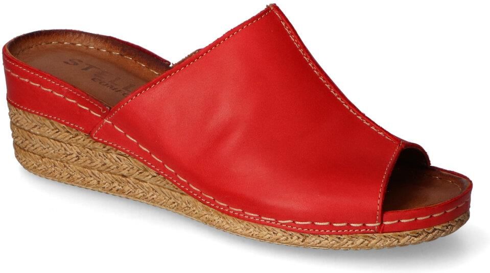 Stylowe klapki damskie firmy Stella :- cholewka wykonana ze skóry naturalnej licowej - wnętrze wykonane ze skóry naturalnej zapewnia komfort podczas użytkowania - skórzana wkładka wewnętrzna zapewnia wygodę chodzenia - koturn o wysokości 5 cm doskonale stabilizuje stopę - czerwony kolor oraz modny fason tworzą efekt, który zachwyci każdego!