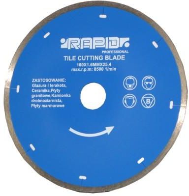 TARCZA DIAMENTOWA 125 x 22.2 x 1.2 RAPID LASER CHARAKTERYSTYKA Tarcza diamentowa RAPID fi 125mm do glazury i terakoty, kamienia. Profesjonalna tarcza diamentowa o wysokiej jakości do cięcia. Przeznaczona do pracy w szlifierkach kątowych na sucho i mokro. Tarcze te posiadają dużą koncentrację wysokiej jakości diamentu. Spoiwo jest miękkie, co pozwala na ciągłe uzyskiwanie nowej powierzchni tnącej. Tym samym utrzymujemy wysokiej klasy cięcie podczas całego czasu pracy tarczy. Cechy te polepszają jakość cięcia i żywotność tarczy. Parametry Średnica zewnętrzna tarczy (D) - 125 mm Grubość segmentów (U) - 1,2 mm Wysokość segmentów (W) - 6,0 mm Średnica wewnętrzna otworu (H) - 22,2 mm Maksymalna prędkość obrotowa - 12200rpm Maksymalna prędkość obwodowa - 80 m/s Typ segmentu - z obwodem ciągłym Nacinana laserowo Najwyższa jakość! Laserowe nacięcia na tarczy minimalizują naprężenia podczas pracy! Gwarantuje to doskonałą jakość cięcia i dłuższą żywotność tarczy! Tarcze do cięcia na sucho! Wysokie właściwości tnące, bardzo duża żywotność! Czyste, szybkie cięcie!