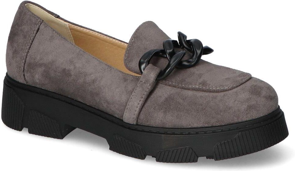 Eleganckie mokasyny firmy Kamex-but: - cholewka wykonana została z ekozamszu - wnętrze zostało pokryte skórą ekologiczną aby zapewnić komfort podczas użytkowania - wkładka wewnętrzna została wykonana ze skóry ekologicznej - obcas o wys. 4 cm zapewnia stabilizację i nadaje elegancji - szary kolor w połączeniu ze czarnym łańcuszkiem tworzą efekt, który zachwyci każdą kobietę!