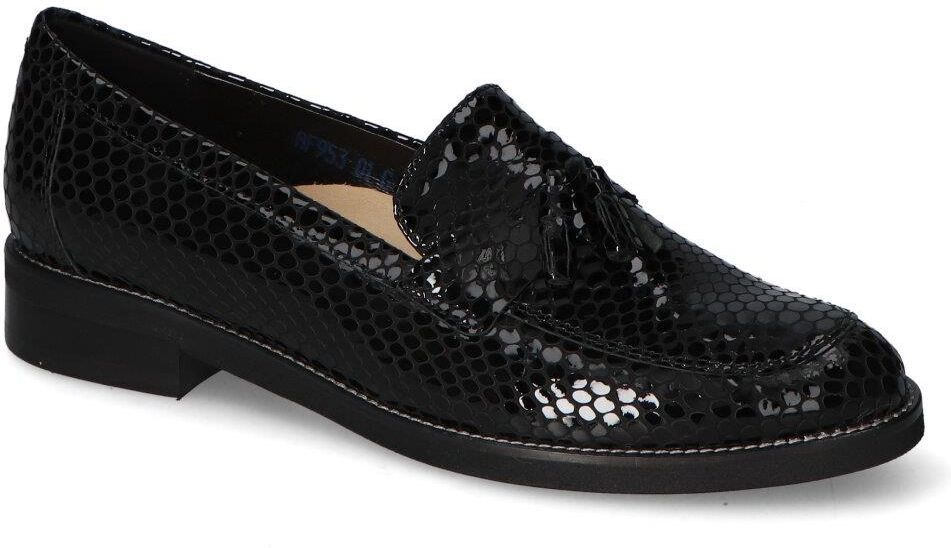 Modne mokasyny damskie Pulso: - cholewka wykonana została ze skóry naturalnej lakierowanej - wnętrze pokryte zostało skórą naturalną aby zapewnić komfort podczas użytkowania - wkładka wewnętrzna wykonana ze skóry naturalnej - obcas o wys. 3 cm zapewnia odpowiednią stabilizację - czarny kolor, piękny wzór i modny fason tworzą efekt, który zachwyci każdego!