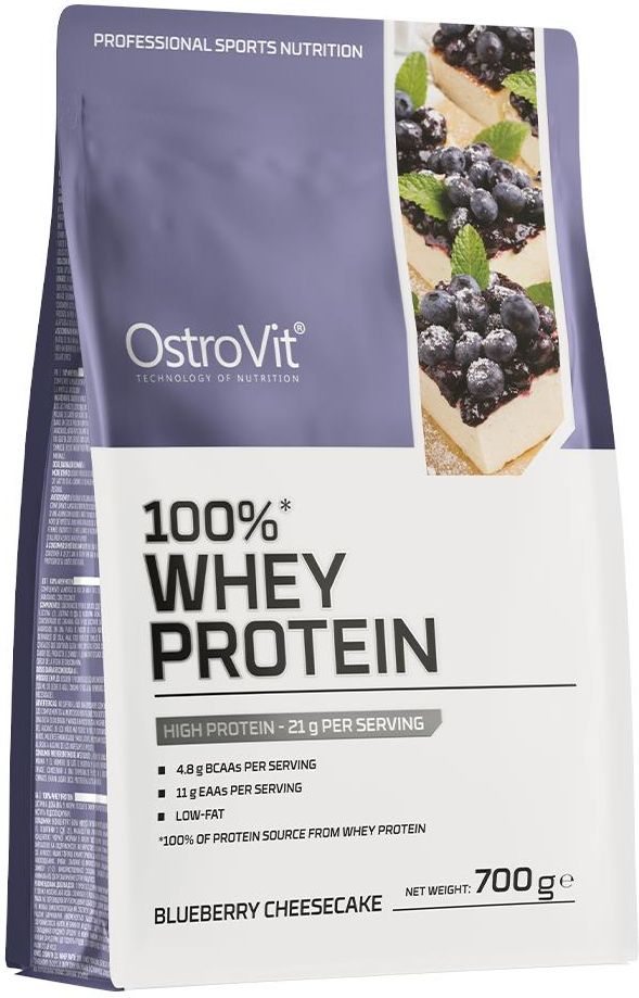 OstroVit 100% Whey Protein 700 g BIAŁKO SERWATKOWE WPC 80 ODŻYWKA BIAŁKOWA Smak: sernika jagodowego Suplement diety OstroVit 100% Whey Protein ⭐️ to suplement diety, który stanowi źródło koncentratu białka serwatki, zawierającego aż 70% wysokiej jakości protein. To preparat, który dostarcza do organizmu aminokwasy rozgałęzione BCAA, a także niezbędne aminokwasy egzogenne EAA. To niskotłuszczowy produkt, dostępny w postaci proszku w różnych wariantach smakowych, który został stworzony z myślą o sportowcach i osobach, którym zależy na uzupełnieniu codziennej diety w cenny makroskładnik. Źródło wysokiej jakości białka - jedna porcja suplementu diety dostarcza do organizmu 21 g protein, pochodzących z koncentratu białka serwatkowego. Źródło aminokwasów rozgałęzionych BCAA - jedna porcja produktu zawiera 4,8 g BCAA. Źródło aminokwasów egzogennych EAA - jedna porcja preparatu stanowi źródło 11 g niezbędnych aminokwasów. Niska zawartość tłuszczu - jedna porcja produktu dostarcza do ustroju 0,7 g tłuszczu. Bez dodatku cukru - odżywka zawiera niskoenergetyczną substancję słodzącą, jaką jest sukraloza, co przyczynia się do obniżenia kaloryczności produktu. Różne warianty smakowe - mnogość kompozycji smakowych sprawia, że każdy znajdzie coś dla siebie. 1 porcja = 2,5 miarki = 30 g. Wydajność - opakowanie produktu zawiera 23 porcje preparatu. Wygodna forma - preparat dostępny w postaci proszku zapewnia bezproblemową podaż suplementu diety i świetnie sprawdzi się wśród osób, które mają trudności z połykaniem tabletek. Masa netto produktu: 700 g Ilość porcji w opakowaniu: 23 Wielkość porcji: 30 g Wartość odżywcza w 1 porcji, na 2 Porcje, na 100 g Wartość energetyczna 479 kJ / 113 kcal, 957 kJ / 226 kcal, 1595 kJ / 377 kcal Tłuszcz: 0.7 g, 1.3 g, 2.2 g - w tym nasycone kwasy tłuszczowe 0.4 g, 0.8 g, 1.3 g Węglowodany: 4.5 g, 9 g, 15 g - w tym cukry 1.9 g, 3.8 g, 6.4 g Białko 21 g, 42 g, 70 g Sól 0.13 g, 0.25 g, 0.42 g Składniki aktywne w 1 porcji, na 2 Porcje, na 100 g Koncentrat białek serwatkowych 26.7 g, 53.4 g, 89 g Składniki: Koncentrat białka serwatkowego z mleka [zawiera lecytyny (1); lecytyny z soi (2)], maltodekstryna, aromaty, barwnik: koncentrat z czarnej marchwi w proszku; substancja słodząca: sukraloza. Wyprodukowano w zakładzie wykorzystującym składniki pochodzące z soi, orzeszków ziemnych, innych orzechów, nasion sezamu, zbóż zawierających gluten, jaj, skorupiaków, ryb. W zależności od użytych składników symbol (1-2) użytego składnika znajduje się w pobliżu daty minimalnej trwałości. Suplement diety w proszku. Zawiera substancję słodzącą. Jak spożywać 100% Whey Protein Porcję 30 g (2.5 miarki) wymieszać w 200 ml chudego mleka lub wody. Spożywać 1 - 2 razy dziennie w zależności od zapotrzebowania. Nie przekraczać zalecanej dziennej porcji do spożycia. Suplement diety nie może być stosowany jako substytut (zamiennik) zróżnicowanej diety. Zalecany jest zrównoważony sposób żywienia i zdrowy tryb życia. Nie spożywać w przypadku uczulenia na którykolwiek ze składników produktu. Produkt nie powinien być stosowany przez dzieci, kobiety w ciąży i matki karmiące. Przechowywać w sposób niedostępny dla małych dzieci. OstroVit 100% Whey Protein - Źródło wysokiej jakości białka Białko serwatkowe powstaje z serwatki, która stanowi składnik uboczny produkcji sera. To zwierzęce źródło protein, które wykorzystywane jest przez osoby aktywne fizycznie, niezależnie od celu treningowego, poziomu wytrenowania i doświadczenia. Można wyróżnić trzy rodzaje białek serwatki - koncentrat białka serwatkowego (WPC), hydrolizat białka serwatki (WPH) oraz izolat białka serwatki (WPI). W OstroVit 100% Whey Protein wykorzystano koncentrat białek serwatkowych z mleka, które wyróżniają się dobrą rozpuszczalnością, świetną przyswajalnością i krótkim czasem wchłaniania, co pozytywnie oddziałuje na jakość suplementacji. Właściwości składników Zawartych w OstroVit 100% Whey Protein Białko przyczynia się do wzrostu masy mięśniowej i wspomaga utrzymanie masy mięśniowej, a także wspiera zachowanie zdrowych kości.
