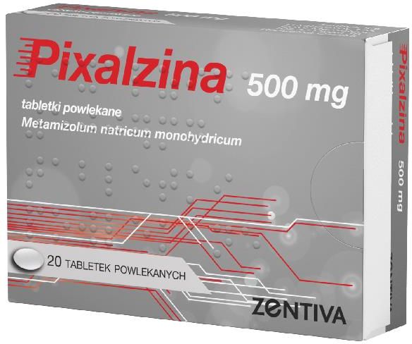 Pixalzina to produkt leczniczy w postaci tabletek, stosowany w bólach różnego pochodzenia o dużym nasileniu. Skład: Substancją czynną leku jest metamizol sodowy jednowodny. Każda tabletka powlekana zawiera 500 mg metamizolu sodowego jednowodnego (Metamizolum natricum monohydricum). Substancje pomocnicze: Rdzeń tabletki: skrobia kukurydziana, laktoza jednowodna, makrogol 6000, powidon (K 25), magnezu stearynian, skrobia ziemniaczana. Otoczka: talk, kopolimer metakrylanu butylu zasadowy, tytanu dwutlenek (E171), magnezu stearynian, olej rycynowy oczyszczony. Wskazania i działanie: Pixalazina to lek w postaci tabletek powlekanych, zawiera w składzie metamizol sodowy jednowodny, należący do grupy leków zwanych pirazolonam. Pixalazina jest lekiem przeciwbólowym, przeciwgorączkowym oraz przeciwskurczowym. Dawkowanie: Zalecana dawka dla dorosłych i młodzieży w wieku powyżej 15 lat (o masie ciała powyżej 53 kg) to od 1 do 2 tabletek (co odpowiada od 500 do 1000 mg metamizolu), które można przyjmować do 4 razy na dobę w odstępach co 6 do 8 godzin. Maksymalna dawka dobowa to 8 tabletek (co odpowiada 4000 mg metamizolu). Działania leku Pixalzina należy spodziewać się w ciągu 30 – 60 minut i utrzymuje się przez około 4 godziny. Tabletki zaleca się połykać w całości, bez rozgryzania, popijając dostateczną ilością wody (około pół szklanki). Lek Pixalzina można przyjmować z jedzeniem lub bez. Nie należy przyjmować leku Pixalzina dłużej niż 3 – 5 dni Przeciwwskazania: Nie należy stosować leku Pixalzina w przypadku: nadwrażliwości na którykolwiek składnik leku, zaburzenia czynności szpiku kostnego lub zaburzeń układu krwiotwórczego, pacjentów z rozpoznanym zespołem astmy analgetycznej lub znaną nietolerancją na leki, przeciwbólowe objawiające się pokrzywką, obrzękiem naczynioworuchowym; wrodzonym, niedoborem dehydrogenazy glukozo-6-fosforanowej (zagrożenie hemolizą), ostrej przerywanej porfirii wątrobowej, trzeciego trymestru ciąży. Producent: Zentiva k.s. U kabelovny 130 102 37 Praga 10, Czechy