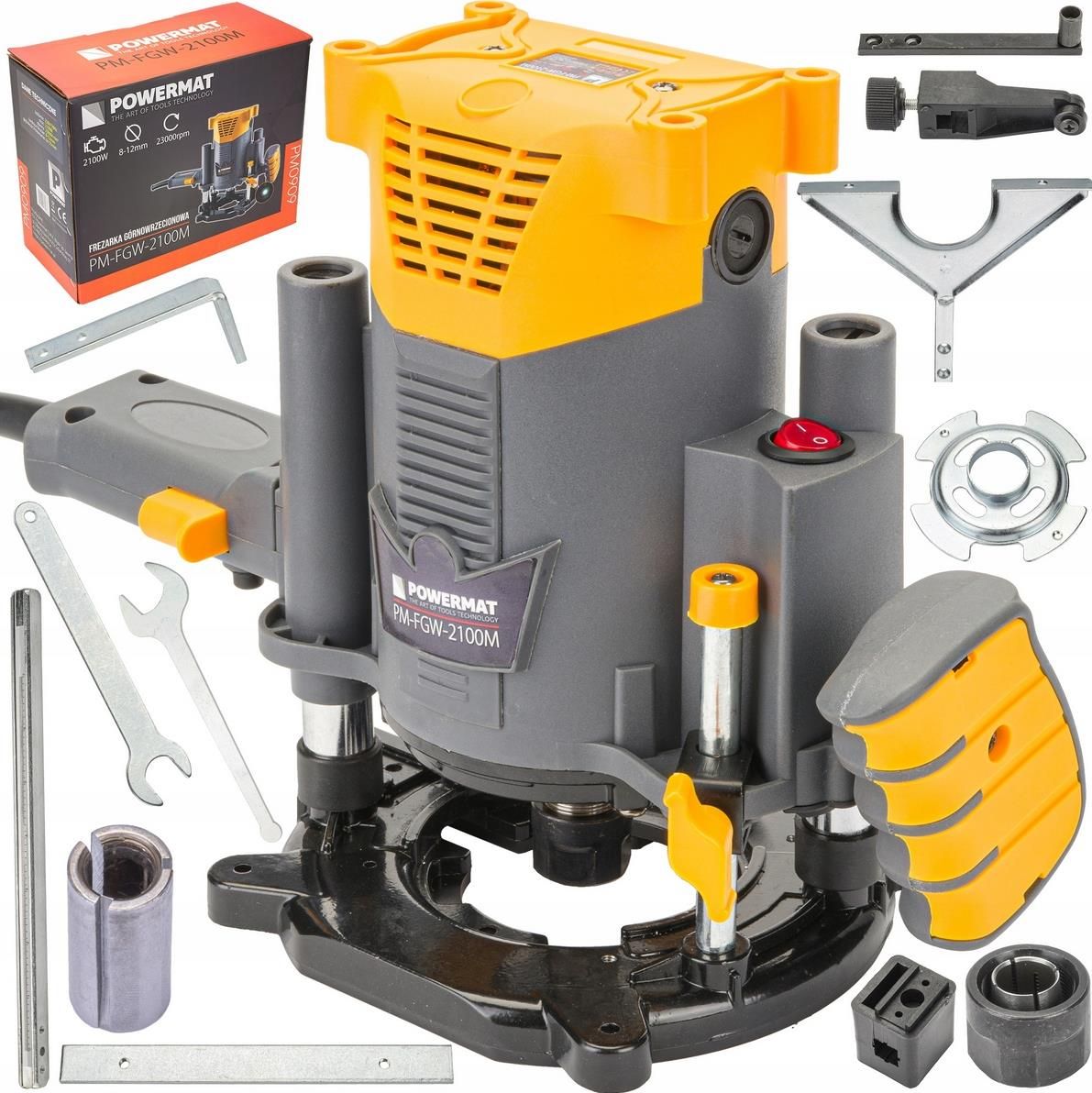 FREZARKA GÓRNOWRZECIONOWA 2100W - WYCINARKA POWERMAT PM-FGW-2100M Dane techniczne Model: Powermat PM-FGW-2100M Moc znamionowa: 2100W Napięcie zasilania: 230 V / 50 Hz Średnice frezów: 8 mm / 12 mm Skok zespołu frezowego: 35mm Głębokość frezowania: do 55mm Prędkość obrotowa: 23000 obr./min Długość przewodu zasilającego: 175 cm Kompaktowa i lekka konstrukcja zwiększa łatwość użytkowania i komfort pracy Wyposażenie Frezarka Prowadnica równoległa Prowadnica konturowa Pierścień kopiujący Pudełko Cyrkiel Kątownik Płaskownik Blok montażu prowadnic Tulejka zaciskowa 8 mm Tulejka zaciskowa 12 mm 2x klucz do nakrętki Instrukcja obsługi PL Frezowanie wgłębne Nastawny ogranicznik głębokości pozwala precyzyjnie dobrać głębokość Motylek pozwalający zablokować urządzenie na żądanej głębokości frezowania Możliwość zamocowania prowadnicy równoległej, konturowej oraz cyrkla na liniale Pierścień kopiujący Niezbędny podczas pracy z szablonami. Bolec kopiujący biegnie wzdłuż szablonu i przenosi kształt na obrabiany element. Przystawka równoległa Umożliwia równoległe prowadzenie maszyny do krawędzi tnącej Tulejka 12 mm Umożliwia zamocowanie większych frezów o średnicy 12 mm Tulejka 8 mm Umożliwia zamocowanie frezów o średnicy 8 mm Oświetlenie LED Za pomocą przełącznika wbudowanego w korpus frezarki możliwe jest podświetlenie obrabianego materiału lampką ledową znajdującą się pod spodem, obok wrzeciona.