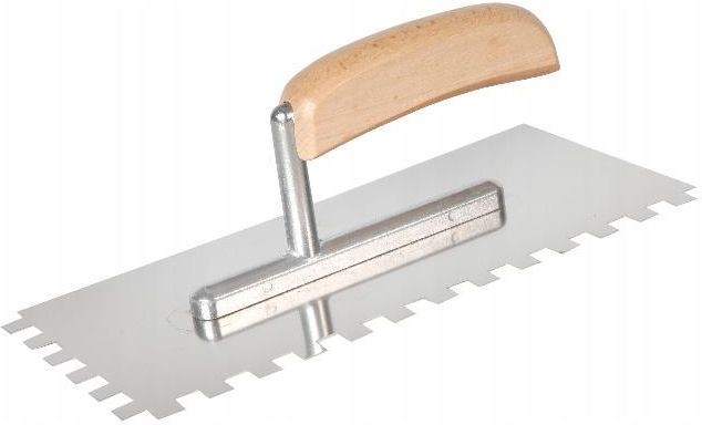 Stal nierdzewna Stopka aluminiowa Rękojeść drewniana otwarta Zęby prostokątne Do nakładania kleju przy pracach glazurniczych (ząb 6 x 6 i 8 x 8), przy układaniu parkietów (ząb 4 x 4), przy rozprowadzaniu zaprawy murarskiej (ząb 10 x 10 i 12 x 12)