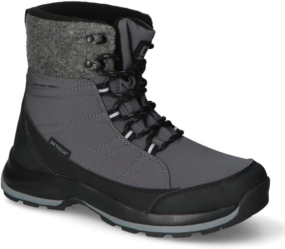 Ciepłe, wygodne damskie śniegowce marki DK: - cholewka wykonana została z wysokiej klasy materiału z membraną AQUA SOFTSHELL, który zapewnia wyższą odporność na wiatr i wodę - wnętrze pokryte zostało materiałem ocieplającym aby zapewnić komfort podczas użytkowania w chłodne dni - sznurowanie ułatwia zakładanie i dopasowanie obuwia - podeszwa DK TECH zapewnia dobrą przyczepność do podłoża i stabilizację podczas chodzenia - szary kolor i modny fason zachwycą każdego!