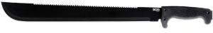 Maczeta ze stałym ostrzem SOG Sogfari MC02-N Całkowita długość 61 cm Długość ostrza 45,7 cm Grubość ostrza 2 mm Waga 522 g Powłoka proszkowa czarna Typ krawędzi prosta, piła na tylnej krawędzi. Brzeszczot stalowy 3Cr13 Materiał rękojeści kraton Twardość Rc. 52-53 Materiał pochwy nylon balistyczny