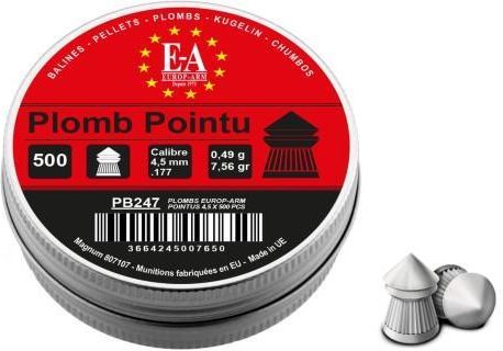 Śrut 4,5mm Europ-Arm ostry 7,56gr Śrut ostry, dzięki mniejszym oporom powietrza uzyskujący większe prędkości i precyzję, znakomicie sprawujący się w strzelaniu na wiekszych odległościach, chętnie stosowany przy strzelaniu do np. puszek, butelek. Specyfikacja:- kaliber 4,5 mm- waga 7,56 gr /0,49 g/- kształt - ostry Opakowanie 500 szt.