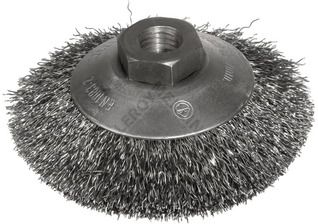 Szczotpol szczotka tarczowo-kątowa 100mm M14 stal Szczotki rotacyjnesłużą do obróbki powierzchni przy zastosowaniu elektronarzędzi. Urządzenie elektryczne wprawia w ruch obrotowy szczotkę, która pracuje w zetknięciu z poddawanym obróbce materiałem. Ta grupa szczotek jest najliczniejsza, należy do niej większość obecnych na rynku produktów szczotkarskich. Obejmuje ona zarówno szczotki wykorzystywane w gospodarstwach domowych, jak i w zakładach pracy. Szczotki rotacyjne tarczowe znajdują skuteczne zastosowanie zarówno w procesach oczyszczania powierzchni, jak również w pracach ukierunkowanych na wytworzenie powierzchni o szczególnych właściwościach i przeznaczeniu. Dane techniczne Średnica D: 100mm Średnica otworu B: nakrętka M14 Szerokość A: 15mm Długość wypełnienia T: 22mm Prędkość obrotowa maksymalna: 12000 obr/min Materiał wykonania: z drutów stalowych