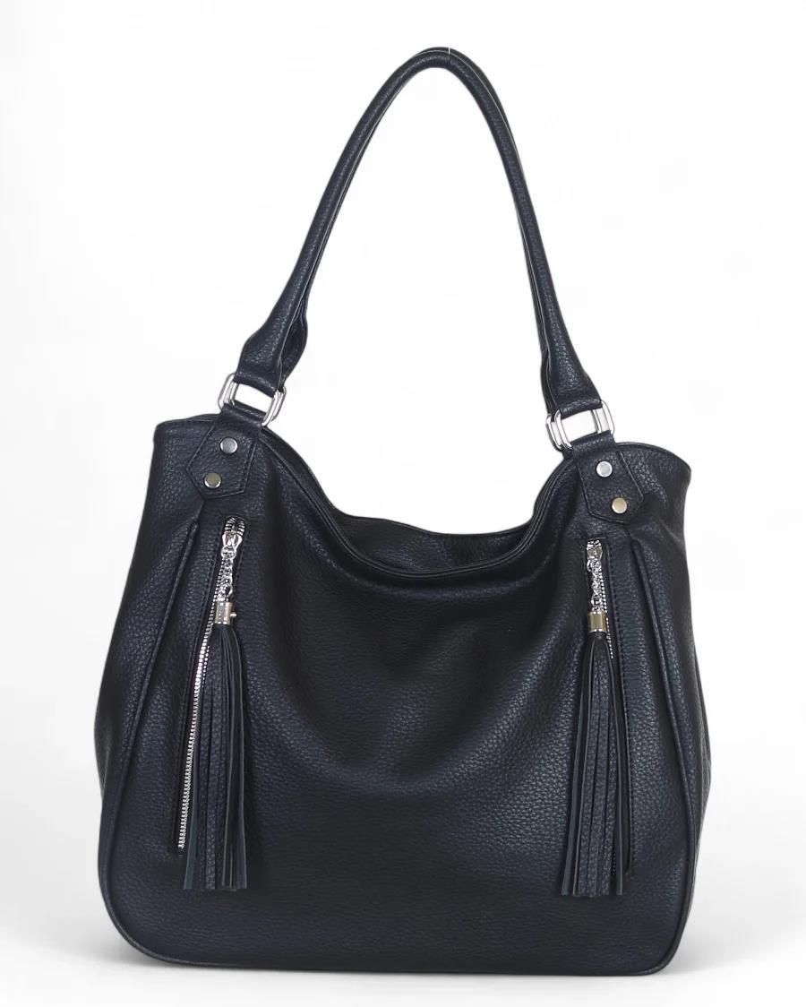 Klasyczna torebka damska wykonana z najwyższej jakości miękkiej skóry ekologicznej, w najmodniejszych kolorach tego sezonu. Torebka wykończona mocną podszewką syntetyczną. Pojemny i praktyczny model mieszczący format A4. Rozbudowane wnętrze pomaga zachować porządek. Wygodne rączki odpowiedniej długości umożliwiają noszenie torebki na ramieniu. Wnętrze dwie komory duża kieszeń na suwak w przegrodzie mniejsza kieszonka na suwak dwie kieszonki wsuwane np. na telefon Na zewnątrz praktyczna kieszonka na zamek z tyłu dwie kieszonki na pionowy suwak z przodu długie, efektowne frędzle na suwakach kieszonek srebrne okucia wygodne rączki do noszenia na ramieniu dodatkowy długi, regulowany pasek do noszenia torebki na ramieniu lub przez ramię Zalety genialny, ponadczasowy design wykonania z dbałością o szczegóły dodatkowy długi pasek piękne kolory najwyższa jakość materiałów praktyczne wnętrze z dużą ilością kieszonek modna faktura materiału pojemny model mieszczący A4 Wymiary wysokość po środku: 29cm szerokość na dole: 36cm głębokość dna: 12cm
