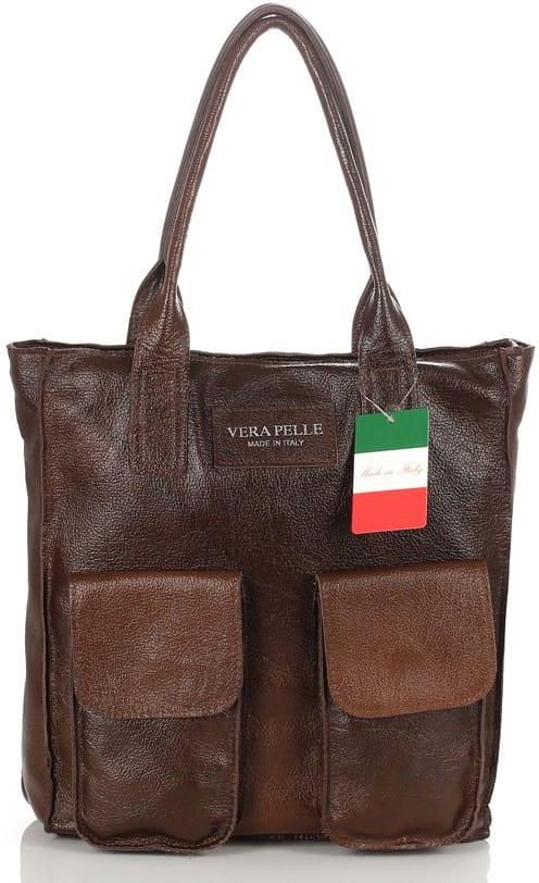 Marka VERA PELLE to czołowy włoski producent galanterii skórzanej.Torebki damskie tej marki to najwyższej jakości roślinnie wyprawiana skóra bydlęca wykończona mocnymi okuciami i wytrzymałą podszewką. Użyte materiały oraz dbałość o każdy detal sprawiają, że każdy model sygnowany logiem VERA PELLE odnosi sukces na europejskim rynku. Niezwykle efektowna torebka damska wykonana z naturalnej skóry ANTYK - delikatnie cieniowanej, lekko nabłyszczanej, bardzo efektownej. Prosty, klasyczny model. Surowe wykończenie szwów dodaje niepowtarzalnego uroku. Na zewnątrz dwie duże kieszonki z przodu, zamykane na magnes delikatnie wytłoczone logo producenta mocne, grube rączki Wnętrze jedna, bardzo pojemna komora główna dwie małe kieszonki wsuwane np. na telefon kieszonka na suwak na tylnej ściance wnętrze wykończone mocną podszewką Wymiary wysokość: 39cm wysokość z rączką: 61cm szerokość dna: 32cm głębokość dna: 9cm