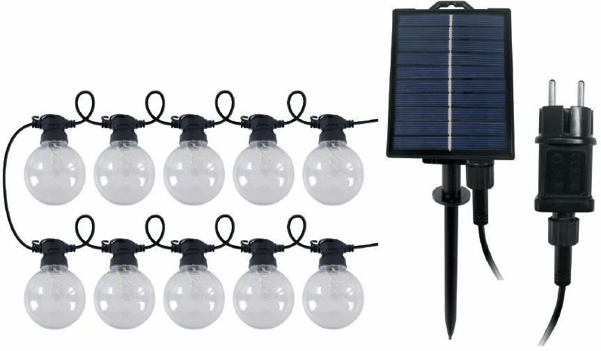 Zasilanie z panelu solarnego lub za pomocą wtyczki sieciowej 230V. Uwaga wskaźnik naładowania baterii, funkcja Powerbanku np. można podładować telefon, możliwość włączenia funkcji świecenia, efekt migotania w zakresie 7 stopni 10 żarówek LED rozmieszczonych co 50 cm. Idealna do oświetlenia ogrodu, patio, werandy, tarasu, balkonu, ogródka piwnego lub na specjalne okazje, takie jak przyjęcia w ogrodzie, święta Bożego Narodzenia czy wesela Stopień ochrony IP44 Możliwość łączenia Barwa światła: ciepła biała (3000K) Rozmiar: 500 x 5 cm Przewód: 300 cm