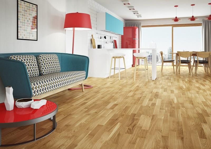 Deski dębowa o wyrazistych przebarwieniach oraz sękach, pokryta lakierem matowym. - Pełna nazwa: Dąb Azure Window - Kolekcja: Decor - nr kat. 3WG000639 - Rodzaj: deska trójwarstwowa - Wymiary: 14x207x2200mm (grub. x szer. x dł. ) - Klasa: family - Ilość lameli: 3 molti - Szczotkowanie: brak - …