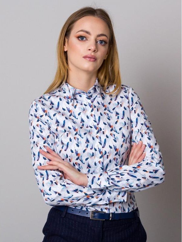 Biała, taliowana koszula damska w niebieskie liście z krytym podpinanym kołnierzykiem