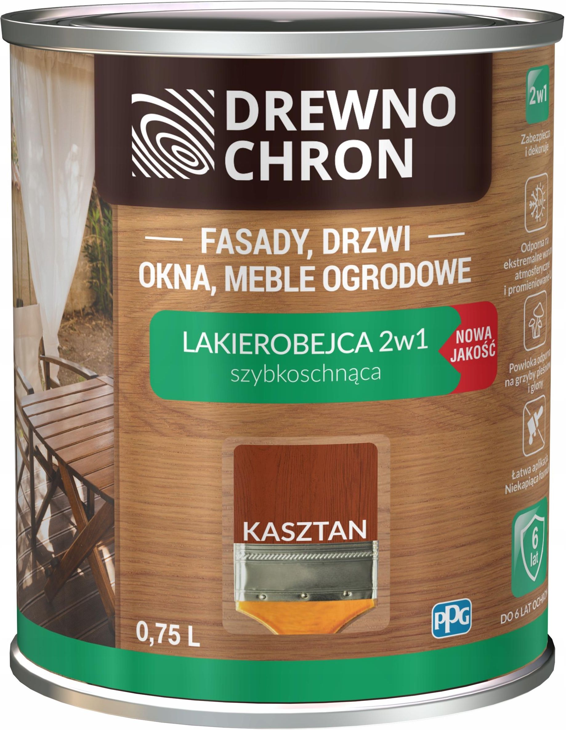 Lakierobejca 2w1 Nowa Jakość Pojemność: 0,75L | Wydajność: do 14 m2/l | Kolor: kasztan _ Dane techniczne: Wydajność: do 14m2/l przy jednej warstwie Zalecana ilość warstw: 1-2 Najważniejsze zalety: 2 w 1 impregnuje i dekoruje przyjemne, łatwe malowanie odporna na działanie promieni UV odporna na zmienne warunki atmosferyczne podkreśla naturalne usłojenie drewna do wnętrz i na zewnątrz pachnie lasem podczas malowania do 6 lat ochrony powłoki dla powierzchni pionowych, w zależności od warunków eksploatacji Transparentna lakierobejca nadaje eleganckie, satynowe wykończenie, podkreślając naturalne usłojenie drewna. Na zewnątrz: podbitki, płoty, meble ogrodowe, drzwi, okna, elewacje drewniane, altanki, domki letniskowe. Wewnąrz: drzwi, okna, boazerie.  Sposób stosowania: Przygotowanie podłoża Podłoże wyrównaj, przeszlifuj, odpyl, odtłuść wodnym roztworem detergentu (detergent po zastosowaniu usuń wilgotną szmatką). Z powierzchni uprzednio malowanych usuń złuszczenia, przeszlifuj i odpyl.   Powierzchnia powinna być czysta i sucha. Przedmioty eksploatowane na zewnątrz pomieszczeń (uprzednio nie malowane) zaimpregnuj Impregnatem Grunt R lub Impregnatem Extra bezbarwnym marki Drewnochron   Wewnątrz pomieszczeń surowe drewno zagruntuj Lakierobejcą 2 w 1 z dodatkiem 20% wody Lakierowanie Lakierobejcę przed użyciem dokładnie wymieszaj.  Wewnątrz pomieszeń nałóż 1-2 warstwy wyrobu w zależności od oczekiwanego efektu dekoracyjnego. Na zewnątrz należy nanieść min. 2 warstwy. Pomiędzy warstwami zachować przerwę 2 godzin. Pełne wyschnięcie powłoki uzyskuje się po 4 godzinach. Niska temperatura i wysoka wilgotność wydłuża czas schnięcia. Dla uzyskania lepszego efektu dekoracyjnego poprzednią warstwę przeszlifuj drobnoziarnistym papierem ściernym i usuń pył. Narzędzia należy myć w wodzie. Unikać uwolnienia do środowiska. Zawartość pojemnika jak i pojemnik utylizować zgodnie z lokalnymi, regionalnymi, narodowymi oraz międzynarodowymi przepisami. Nie wdychać rozpylonej cieczy. W przypadku niedostatecznej wentylacji stosować indywidualne środki ochrony dróg oddechowych. Zawiera mieszanina poreakcyjna 5-chloro-2-metylo-2H-izotiazol-3-onu i 2-metylo-2H-izotiazol-3-onu (3:1) i 1,2-benzoizotiazol-3(2H)-on. Może powodować wystąpienie reakcji alergicznej. .lnd_object .lnd_text .lnd_content { font-size: 16px; }
