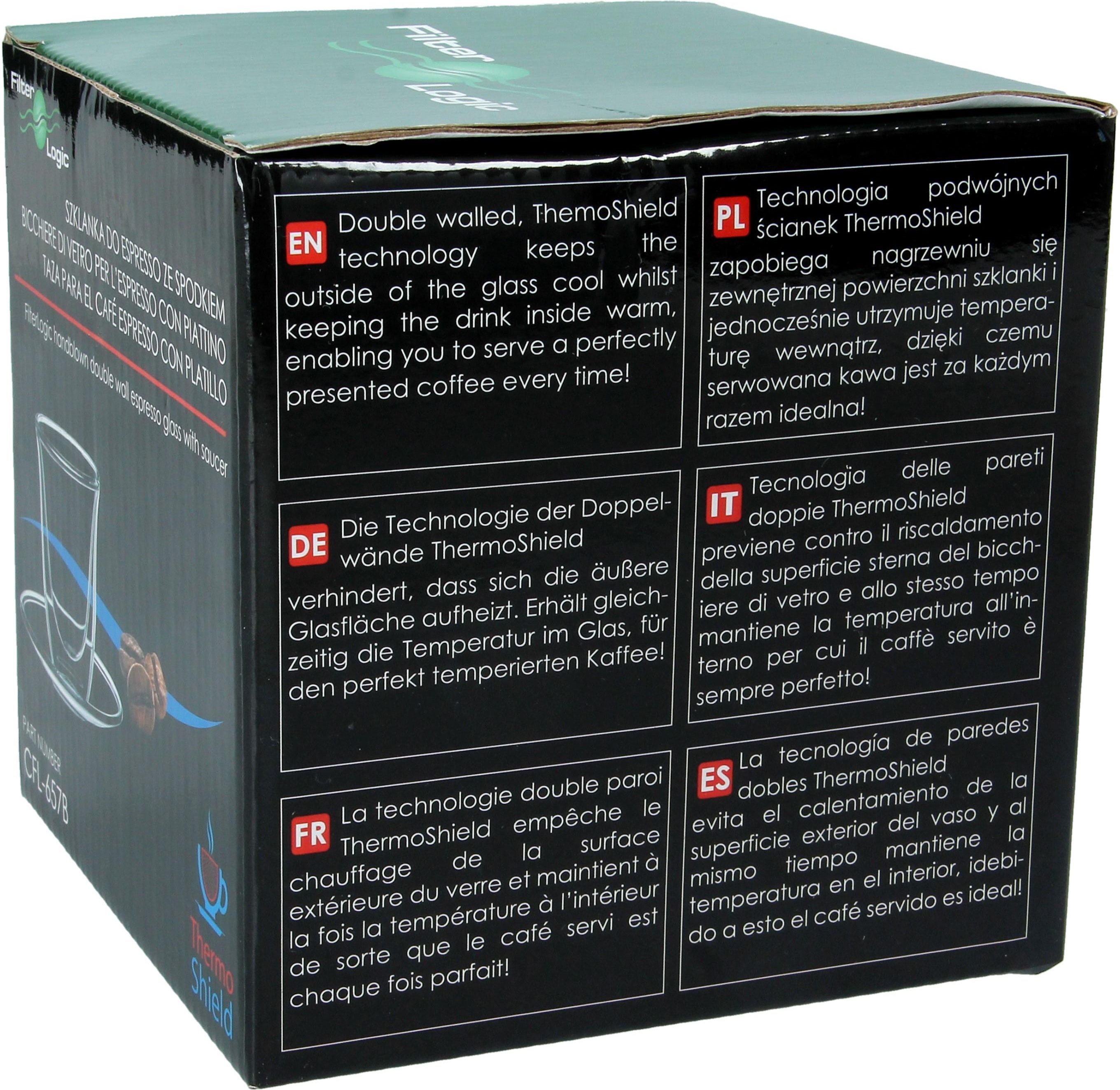 Szklanka termiczna ze spodkiem do kawy espresso FilterLogic CFL-657 (1 szt.) Producent: FilterLogic Typ produktu: szklanka ze szkła borokrzemowego ze spodkiem Pojemność: 70 ml Wysokość: 65 mm Materiał: szkło borokrzemowe Zestaw zawiera: 1 szklankę i 1 spodek Szklanka termiczna do espresso Ręcznie …