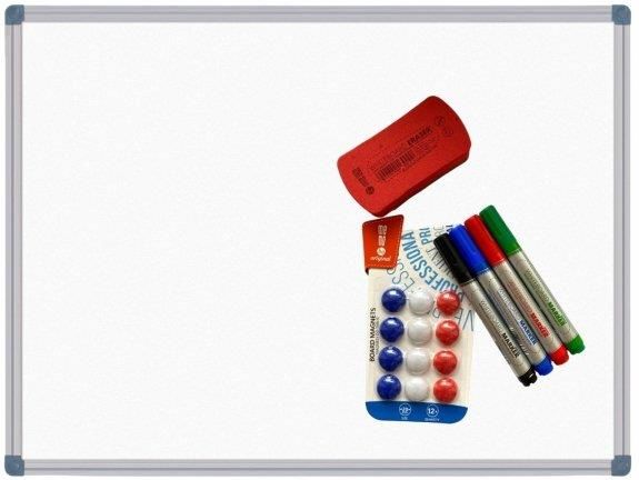 Tablica suchościeralna 60x40 cm ZESTAW Kod producenta: GP-TMA-6040+MZA1+1+4 Tablica: ✅ Rodzaj: tablica suchościeralna magnetycznaRozmiar: 60cm x 40cm Markery: ✅ Kolory: czarny, niebieski, czerwony, zielony Szerokość linii pisania: 2-3 mm Typ końcówki: okrągła Rodzaj: suchościeralny Zmywalny: tak ✅ Magnesy: Ilość: 12 szt. Kolor: mix kolorów (4 niebieskie, 4 białe, 4 czerwone) Średnica: 20 mm ✅ Gąbka: Materiał: filc Kolor: czerwony Tablica umożliwia zapisywanie ważnych informacji oraz tworzenie notatek za pomocą markera suchościeralnego. Na tablicy można przyczepić kartki lub zdjęcia za pomocą magnesów. Tablice znajdą swoje zastosowanie w biurze, szkole czy domu. W zestawie otrzymują Państwo 1 tablicę suchościeralną, 12 magnesów, 5 markerów, oraz gąbkę magnetyczną.