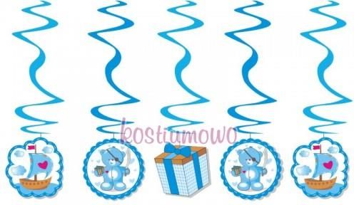 Misiowe Świderki Baner urodzinowy w kolorze niebieskim długość około 60 centymetrów, długość zawieszki z obrazkiem około 14 centymetrów. Misiowe świderki w kolorze różowym lub niebieskim są detalem, który mogą Państwo wykorzystać do organizacji urodzin swojego malucha, jak i do przyozdobienia dziecięcego pokoju. W opakowaniu 5 świderków metalizowanych o długości 60 cm zakończonych tekturowymi obrazkami przedstawiającymi prezenciki, misie i statki żaglowe. UWAGA!!!
