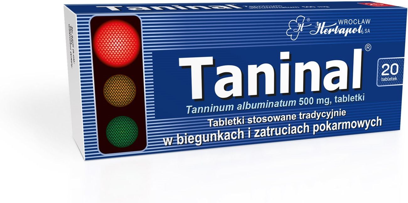 Taninal Wskazania do stosowania Taninal stosuje się tradycyjnie w biegunkach i zatruciach pokarmowych. Taninal jest to produkt leczniczy stosowany tradycyjnie, którego skuteczność opiera się wyłącznie na długotrwałym stosowaniu i doświadczeniu. Taninal zawiera połączenie garbników - kwasu taninowego (taniny) z białkiem - albuminą. Dzięki takiemu połączeniu lek nie wywiera silnego działania drażniącego na błonę śluzową żołądka. Preparat uwalnia garbniki w jelicie cienkim pod wpływem działania enzymu trawiennego pankreatyny. Uwolniona tanina wykazuje działanie ściągające i bakteriostatyczne, działa także przeciwbiegunkowo, tworząc trudno rozpuszczalne kompleksy z toksynami bakteryjnymi. Ponadto hamuje drobne krwawienia przy uszkodzeniach naczyń włosowatych śluzówki jelit.  Skład Substancją czynną leku jest Tanninum albuminatum (białczan taniny) – 500 mg na tabletkę. Substancje pomocnicze to: skrobia ziemniaczana, sól sodowa karboksymetyloskrobi, powidon, talk. Sposób użycia i dawkowanie Dorośli - 3 razy na dobę 1 do 2 tabletek. Dzieci powyżej 4 lat i młodzież do 18 lat - 2 do 3 razy na dobę ½ do 1 tabletki. Dzieci poniżej 4 lat - nie należy stosować. Lek stosować doustnie, tabletkę po zażyciu popić wodą. Przyjmować między posiłkami, do czasu ustąpienia objawów. Ten lek należy zawsze stosować dokładnie tak, jak to opisano w ulotce dla pacjenta lub według zaleceń lekarza lub farmaceuty. W razie wątpliwości należy zwrócić się do lekarza lub farmaceuty. Przeciwwskazania Nie stosować jeśli pacjent ma uczulenie na substancję czynną (białczan taniny) lub którykolwiek z pozostałych składników tego leku. Nie należy stosować u dzieci poniżej 4 lat. Ostrzeżenia i środki ostrożności Jeżeli mimo zastosowanego leczenia biegunka nasila się lub nie ustępuje przez okres dłuższy niż 2-3 dni u dorosłych i młodzieży lub ponad 1 dzień u dzieci, należy zgłosić się do lekarza. Lek Taninal a inne leki  Leku Taninal nie należy stosować równocześnie z innymi lekami. Pomiędzy przyjęciem leku Taninal i innych leków powinny upłynąć co najmniej 2 godziny, ponieważ lek Taninal może hamować wchłanianie innych leków. Stosowanie leku Taninal z jedzeniem, piciem i alkoholem Lek Taninal należy przyjmować między posiłkami. W trakcie leczenia należy przyjmować dużo płynów. Ciąża, karmienie piersią, wpływ na płodność Nie wykonano kontrolowanych badań klinicznych u kobiet w okresie ciąży i karmienia piersią. Przed użyciem leku Taninal należy skonsultować się z lekarzem. Wpływ na płodność nie jest znany. Jeśli pacjentka przypuszcza, że może być w ciąży lub gdy planuje mieć dziecko, powinna poradzić się lekarza lub farmaceuty przed zastosowaniem leku. Prowadzenie pojazdów i obsługiwanie maszyn  Lek ten nie ma wpływu na zdolność prowadzenia pojazdów i obsługiwania maszyn. Możliwe działania niepożądane  Jak każdy lek, lek ten może powodować działania niepożądane, chociaż nie u każdego one wystąpią.  Działania niepożądane leku przedstawiono zgodnie z klasyfikacją narządów i układów wg MedDRA oraz częstością występowania: rzadko - działania niepożądane mogą wystąpić u od 1 do 10 pacjentów na 10 000 pacjentów stosujących lek. Podczas stosowania leku Taninal mogą wystąpić: Zaburzenia żołądka i jelit (nudności, wymioty) – rzadko. Jak wygląda lek Taninal i co zawiera opakowanie  Taninal to tabletki zapakowane w blistry z folii PVC/PVDC/Aluminium po 10 tabletek. Opakowanie stanowi pudełko tekturowe zawierające 2 blistry po 10 tabletek oraz ulotkę dla pacjenta. Podmiot odpowiedzialny i wytwórca Wrocławskie Zakłady Zielarskie „Herbapol” SA 50-951 Wrocław, ul. św. Mikołaja 65/68 e-mail: herbapol@herbapol.pl To jest lek. Dla bezpieczeństwa stosuj go zgodnie z ulotką dołączoną do opakowania. Nie przekraczaj maksymalnej dawki leku. W przypadku wątpliwości skonsultuj się z lekarzem lub farmaceutą.