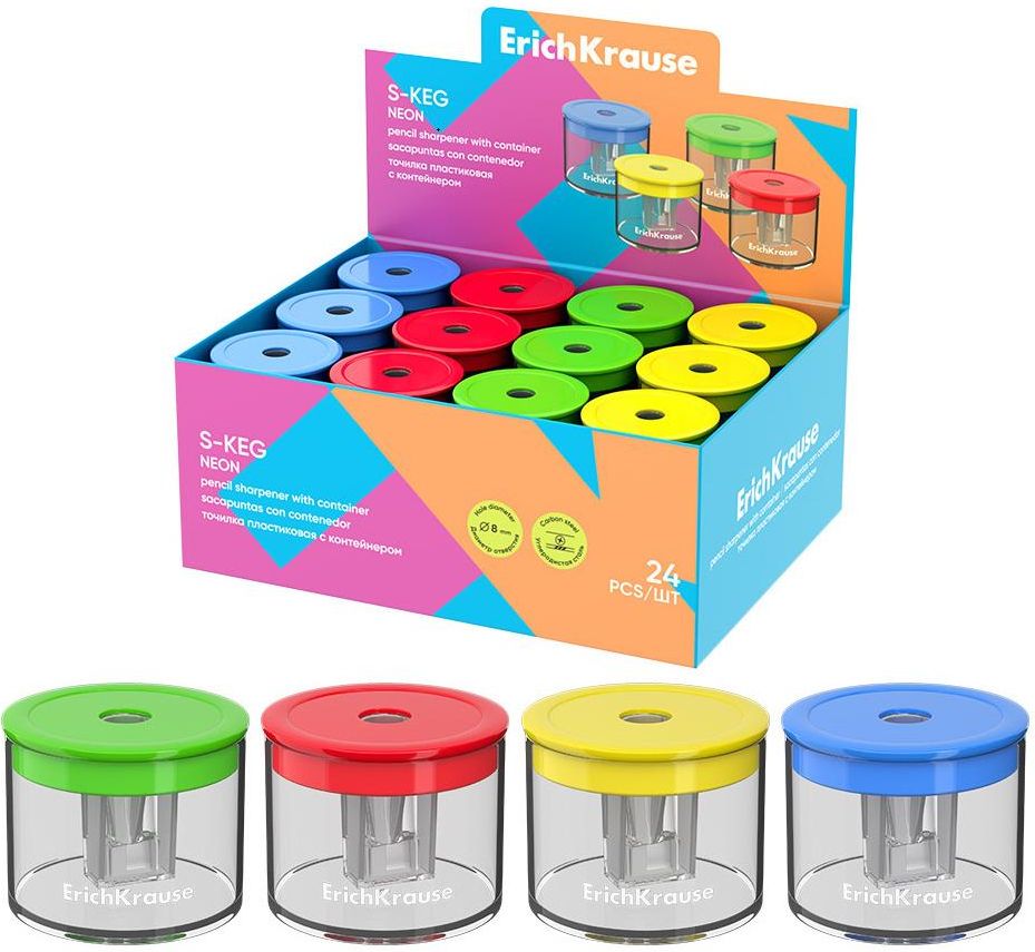 Temperówka Erich Krause S-Keg Neon z pojemnikiem Temperówka Erich Krause S-Keg Neon z pojemnikiem – trwała, wygodna, z ostrzem ze stali węglowej. Idealna do szkoły, biura i domu. Praktyczna temperówka wykonana z trwałego plastiku, wyposażona w przezroczysty pojemnik na strużyny. Posiada otwór o średnicy 8 mm, idealny do ołówków i kredek. Ostrze z niklowanej stali węglowej zapewnia szybkie i precyzyjne ostrzenie. Neonowe kolory dodają nowoczesnego charakteru.