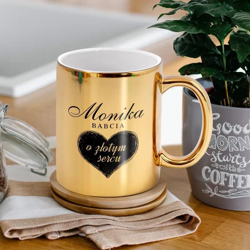 Piękny złoty kubek, jak złote serce Twojej babci to upominek pełen miłości. Wraz z nadrukiem imienia przykuwa swoją uwagę i będzie idealnym prezentem dla babci, która lubi się wyróżniać. Od tej pory będzie to jej ulubiony kubek, bo będzie jej przypominał o Tobie. Parametry pojemność: 330 ml wysokość: 9,5 cm średnica u góry: 8 cm materiał: ceramiczny kolor: złoty nadruk wykonywany jest techniką sublimacji kubek przeznaczony jest do mycia ręcznego, jednak jego powłoka dopuszcza czyszczenie także w zmywarkach Personalizacja Aby w pełni spersonalizować prezent, skorzystaj z naszego edytora. Wprowadź odpowiednie dane, a nasi graficy zajmą się resztą.