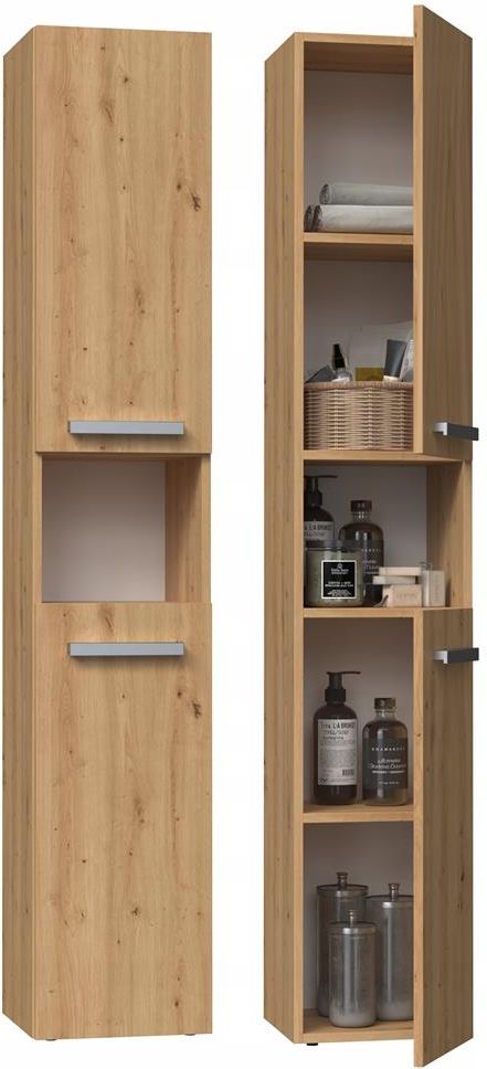 SZAFKA ŁAZIENKOWA, REGAŁ, SŁUPEK LEN I KORPUS: DĄB ARTISAN FRONT: DĄB ARTISAN WERSJA Z KRÓTKIMI DRZWIAMI W każdej łazience znajdą się rzeczy, które potrzebują swojego miejsca. Dzięki praktycznym słupkom, skutecznie zapanujesz nad bałaganem, nie zajmując zbyt wiele przestrzeni. ▶️ Dlaczego nasza szafka: ✔️ Uniwersalny wygląd sprosta oczekiwaniom wszystkich, którzy cenią połączenie prostoty i elegancji. ✔️ Minimalistyczne uchwyty w kolorze srebrnym zapewniają wygodny dostęp do zawartości mebla. ✔️ 5 praktycznych półek. ✔️ Staranna jakość wykonania. ✔️ Możliwość wyboru strony otwierania drzwiczek – lewostronnie/prawostronnie - bezpośrednio przy montażu. ✔️ Polski producent. ▶️ Wymiary szafki: Głębokość: 30 cm Szerokość: 31 cm Wysokość: 174 cm ▶️ Użytkowanie: Powierzchnię mebla czyścić przy pomocy miękkiej szmatki. Unikać stosowania silnie działających środków chemicznych. ✂️ Produkt przeznaczony do samodzielnego montażu. Instrukcja montażu wraz ze wszystkimi potrzebnymi akcesoriami montażowymi znajduje się w opakowaniu.