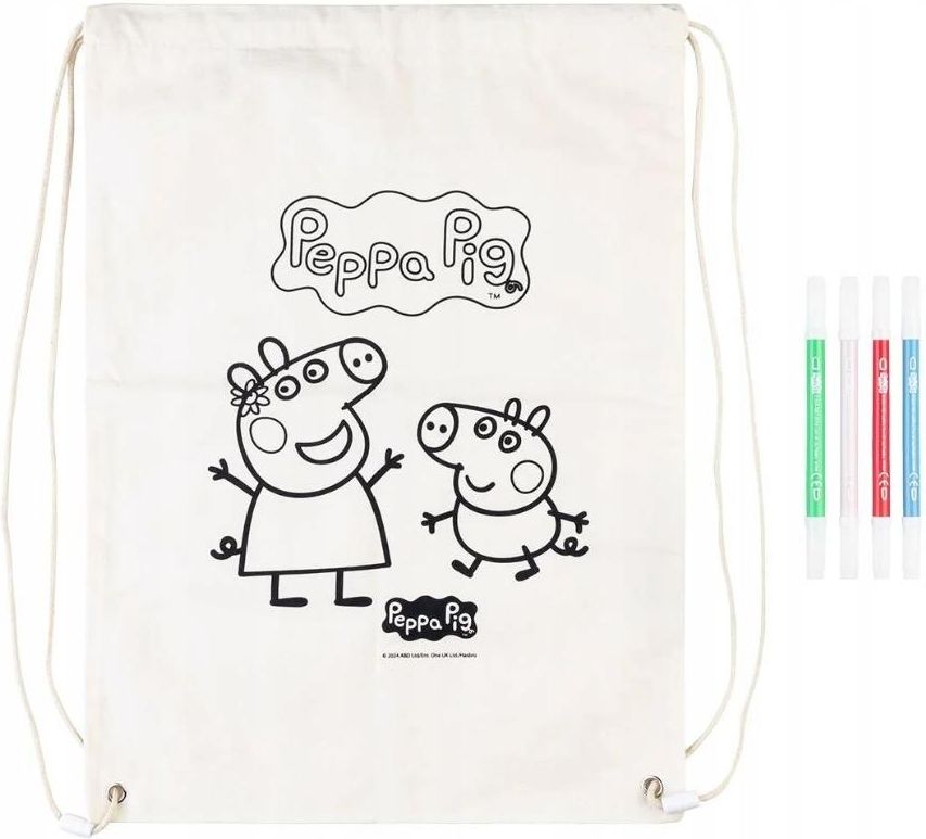 Worek do kolorowania Świnka Peppa 3+ Flamastry Plecak Kolorowanka Bawełna Kolorowanki dla dzieci - worek ze sznurkiem do kolorowania Każdy maluch kocha kolorowanki, dlatego podarowanie mu tak niekonwencjonalnej formy tej zabawy będzie dla dziecka nie lada zaskoczeniem i bardzo je zaciekawi Worek do …