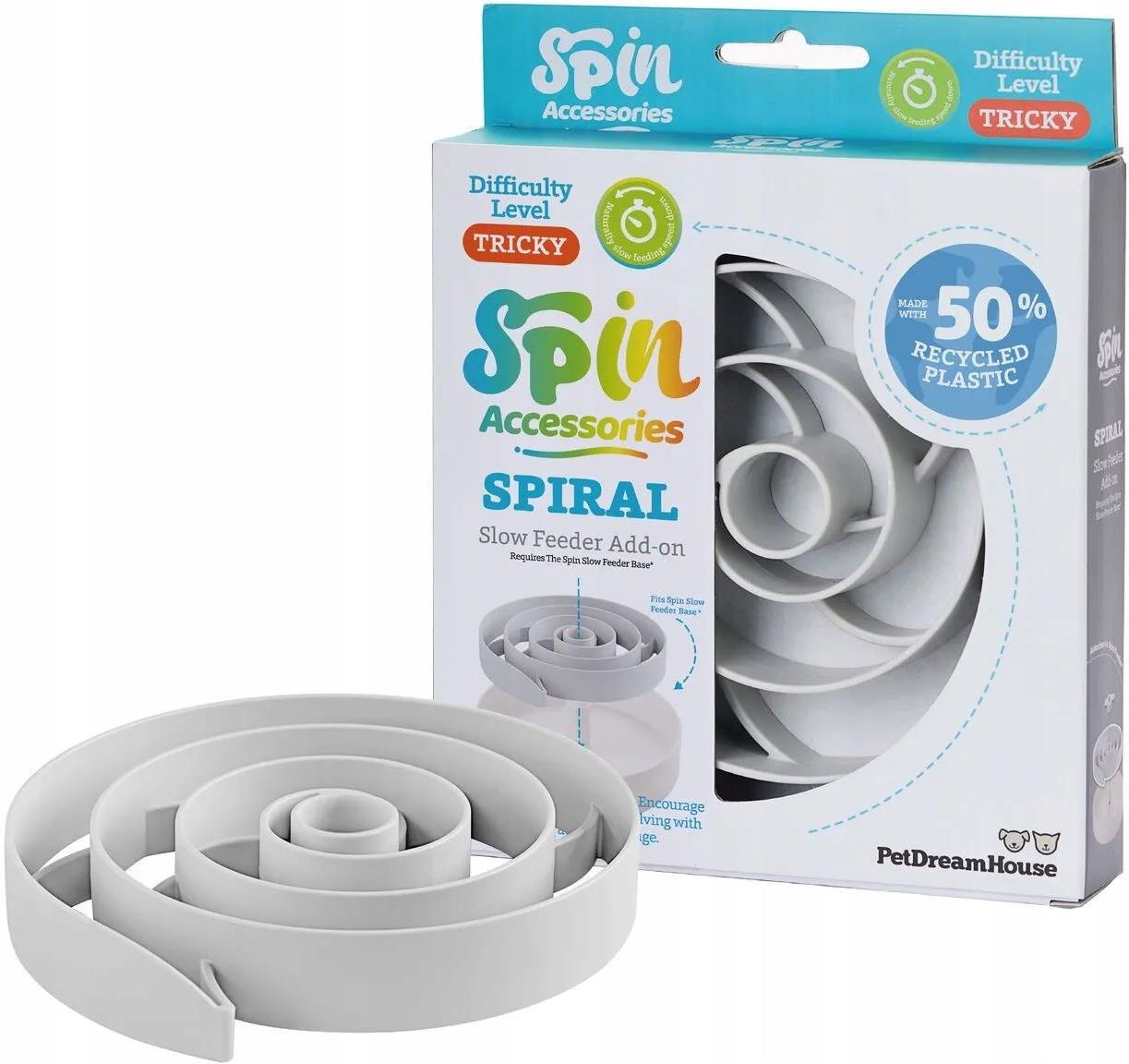 SPIN WKŁAD SPIRALA SZARA SPIN WKŁAD SPIRALA SZARA Akcesorium zamienne dla miski Spirala. Spin Palette to dynamiczna miska do powolnego karmienia, która zamienia posiłek psa lub kota w zabawę i interaktywne karmienie. Miski Spin zachęcają do wąchania, lizania i rozwiązywania problemów podczas posiłków, co w sposób naturalny spowalnia jedzenie i zapobiega zadławieniu, wzdęciom i zbyt szybkiemu jedzeniu. Każda miska ma wielofunkcyjny centralny element układanki, którego wysokość i opór można regulować, aby dostosować do możliwości pupila lub wprowadzić urozmaicenie.Każda miska ma cztery duże pierścienie antypoślizgowe, które zapewniają wysoką stabilność. INTERAKTYWNOŚĆ Posiłek zamienia się w aktywną zabawę i poszukiwanie metod na zdobycie przysmaków. Spin zapewnia zaangażowanie i ćwiczenie umysłu podczas posiłku. RÓŻNORODNOŚĆ Każda miska Spin może być napełniona różnego rodzaju żywnością: od chrupiących krokietów, po świeże warzywa. Różne kształty i rozmiary przegródek wprowadzają wiele tekstur do odkrywania dla zwierząt. SPOWOLNIENIE JEDZENIA Spin Palette to zabawne wyzwanie dla psów i kotów, a jednocześnie naturalny spowalniacz w konsumpcji. Ta funkcja powolnego karmienia znacznie zmniejsza ryzyko zadławienia, wzdęcia lub innych potencjalnych zagrożeń związanych ze zbyt szybkim jedzeniem. PRZYJAZNE MATERIAŁY Tworzywo nadaje się do recyklingu i nie zawiera BPA ani PVC. Uwaga: Produkt może być nieodpowiedni dla psów z krótkim pyszczkiem.