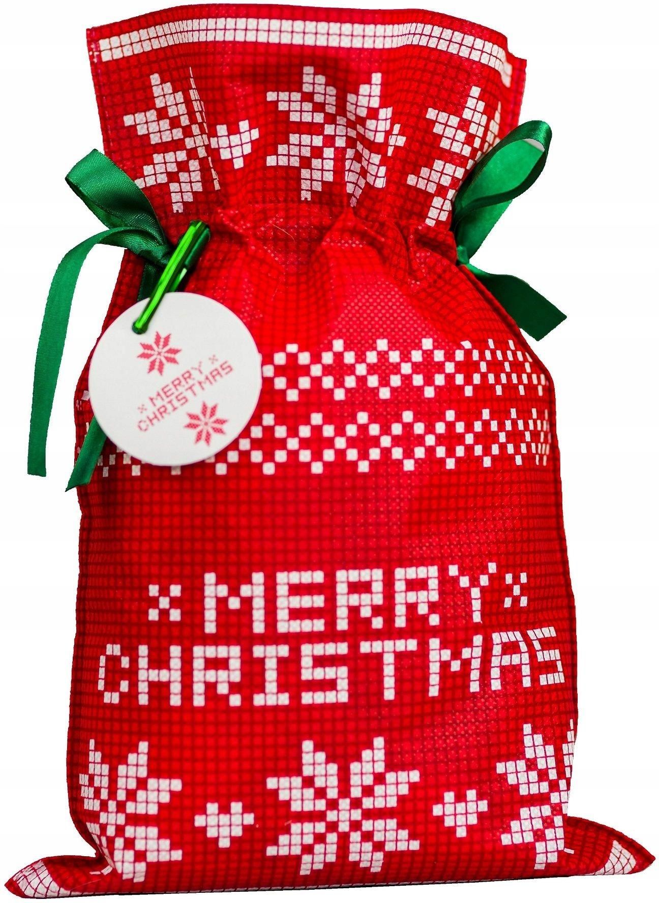 WOREK PREZENTOWY z napisem MERRY CHRISTMAS czerwony NA ŚWIĘTA - 50 x 60 cm Zastanawiasz się w co spakować prezent dla swoich najbliższych z okazji Świąt Bożego Narodzenia? Wybierz piękny woreczek ze świątecznym motywem! Piękny worek prezentowy wykonany z trwałego, przyjemnego w dotyku materiału w kolorze czerwonym z motywem białej gwiazdy betlejemskiej z napisem Merry Christmas. Każdy worek posiada ozdobne wstążeczki, które dodają mu dodatkowego szyku oraz zawieszkę na której można napisać imię obdarowywanej osoby. To eleganckie i efektowne uzupełnienie świątecznego prezentu. W takim opakowaniu każdy podarunek będzie się doskonale prezentował pod choinką. Dzięki takim workom pakowanie prezentów staje się naprawdę proste. Wystarczy pociągnąć za wstążki z obu stron, aby szczelnie zamknąć woreczek. Do woreczkaprzymocowany jest tekturowy bilecik, na którym można zapisać imię obdarowywanej osoby. Szczegółowe informacje Wysokość worka: 60 cm Szerokość worka: 50 cm Materiał: miękka tkanina Wstążki: zaciskowe, które umożliwiają szybkie zapakowanie prezentu. Tekturowy bilecik na imię: TAK Aukcja dotyczy 1 szt. produktu.