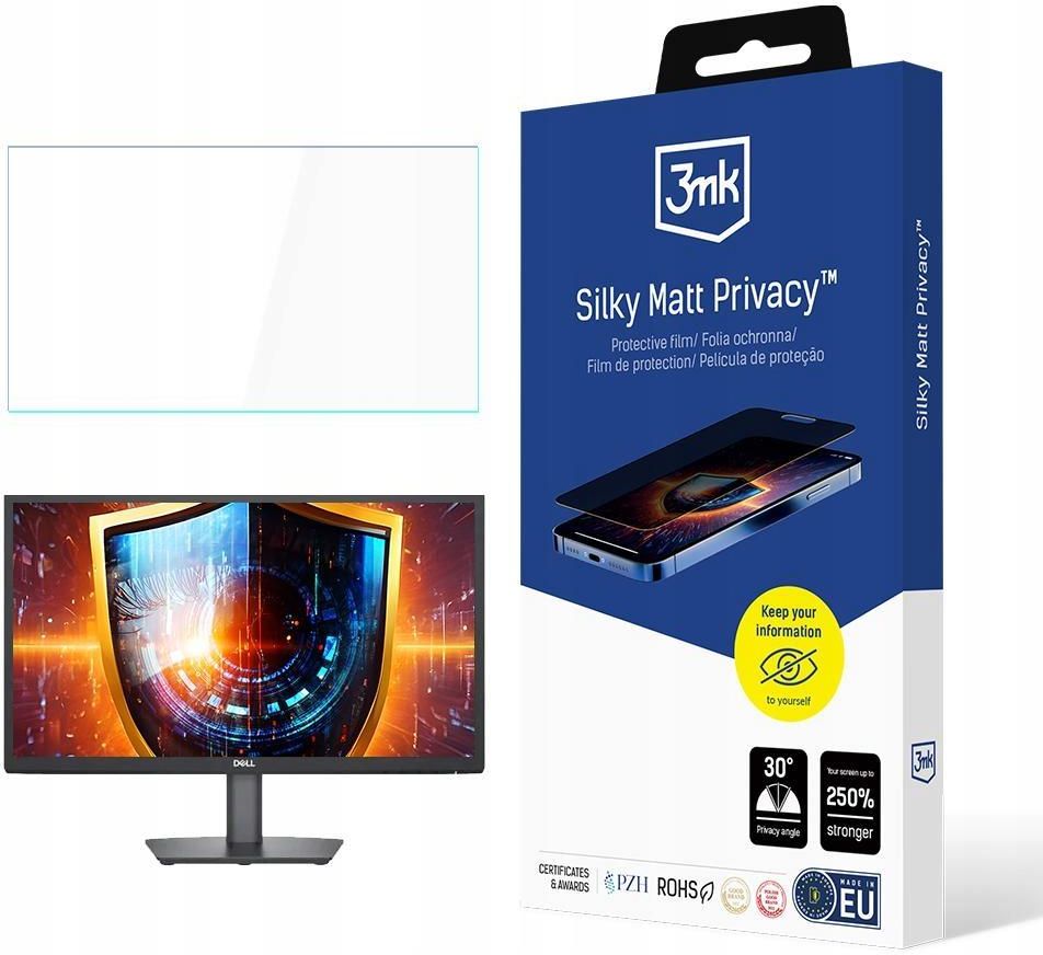 Privacy 2way™ - prywatyzująca folia ochronna Folia prywatyzacyjna, która w prosty sposób pozwala zabezpieczać to, co wyświetlane jest na Twoim ekranie, przed niepożądanym wzrokiem osób postronnych. Z nakładką Privacy 2way™ możesz spokojnie pracować nawet w komunikacji publicznej, bez obaw o wzrok współpasażerów. Chroni podwójnie - Prywatyzacja danych i zabezpieczenie ekranuDba o wzrok - Filtr redukujący szkodliwe światło niebieskieElastyczny montaż - Ramka dla wygody ściągania i zakładania foliiEkran i dane pod ochroną Privacy 2way™ to podwójne bezpieczeństwo korzystania z laptopa w przestrzeni publicznej. Prywatyzująca folia ochronna rozmywa i przyciemnia obraz już od kąta 25o. Chroni wyświetlane treści przed niepożądanymi spojrzeniami, a dodatkowo zapobiega zarysowaniu ekranu. Z nakładką Privacy 2way™ możesz spokojnie pracować nawet w komunikacji publicznej, bez obaw o wzrok współpasażerów. Montujesz tak, jak lubisz Folia ochronna Privacy 2way™, w wersji instalowanej przy użyciu sprytnej ramki, jest dwustronna – z jednej strony matowa, a z drugiej błyszcząca. Folię wygodnie ściągasz i zakładasz ponownie. Możesz ją zamontować na ekranie urządzenia taką stroną, jak w danej chwili potrzebujesz. Powierzchnia błyszcząca tworzy na wyświetlaczu efekt lustra, zapewniając maksymalną prywatność. Natomiast strona matowa skutecznie redukuje odbicia światła i odciski palców, poprawiając estetykę i komfort korzystania ze sprzętu - zwłaszcza w nasłonecznionych miejscach. Żadnych rys na ekranie Privacy 2way™ to same korzyści. Oprócz kluczowej roli prywatyzującej, folia pełni funkcję ochronną. Wzmacnia ekran laptopa, zwiększając jego odporność na zagrożenia wynikające z codziennego użytkowania. Już nie musisz się martwić o przypadkowe zarysowanie wyświetlacza. Redukcja światła niebieskiego Długotrwała praca przed komputerem potrafi być wyczerpująca – szczególnie dla Twojego wzroku. Zadbaj o swoje oczy i wygodę z Privacy 2way™! Folię ochronną uzbroiliśmy w specjalny filtr, który pozwala zredukować emisję szkodliwego światła niebieskiego średnio o 59%. Skład zestawu: Folia Privacy 2way™ z ramką, niepyląca ściereczka, mokra ściereczka. recipe: up to 23" 3mk Privacy 2-way (without glue) bullet1: Ochrona prywatności – dwukierunkowy filtr zapewnia prywatność widzenia, ograniczając kąty widzenia. bullet2: Bez kleju – łatwa aplikacja bez pozostałości kleju, można ją wielokrotnie zdejmować i nakładać. bullet3: Kompatybilność – idealna do monitora Dell E2223HV, pasuje do ekranów o wielkości do 23 cali. bullet4: Ochrona ekranu – chroni przed zarysowaniami i zabrudzeniami, zachowując wysoką przejrzystość ekranu. bullet5: Gwarancja jakości – produkt objęty gwarancją, możliwość zwrotu zgodnie z regulaminem.