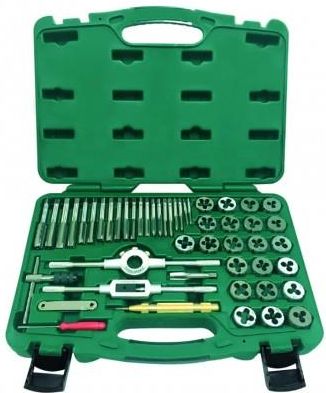 Zawartość zestawu:44 szt. gwintowniki i narzynki: M3X0.5, M3X0.6, M4X0.7, M4X0.75,M5X0.8, M5X09, M6X0.75, M6X1.0, M7X0.75, M7X1.0, M8X1.0, M8X1.25, M9x1.0,M9x1.25,M10x1.0, M10x1.25, M10x1.5,M11x1.5, M12x1.5, M12x1.25 ,M12x1.75, 1/8NPT271 szt. uchwyt do narzynek1 szt. uchwyt do gwintowników1 szt. pokrętło do gwintowników1 szt. grzebień do pomiaru gwintów1 szt. punktak1 szt. wkrętak