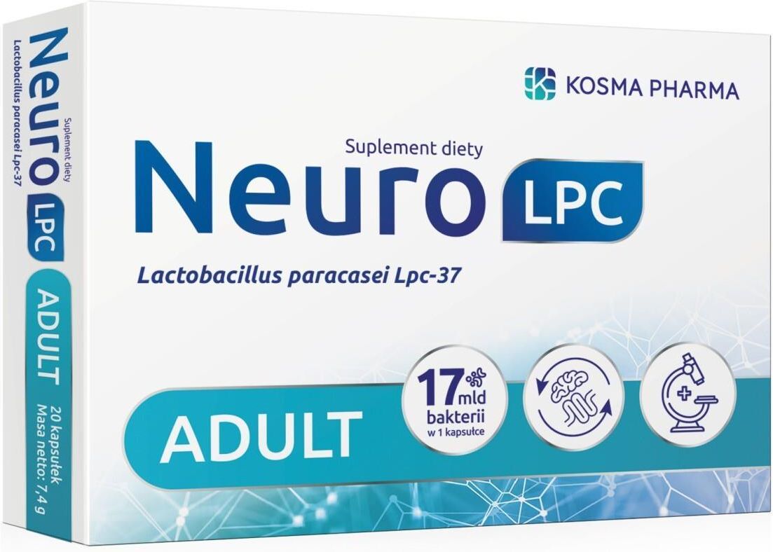 NeuroLPC Adult, 20 kapsułek NeuroLPC Adult to suplement diety w kapsułkach ze szczepem dobroczynnych bakterii Lactobacillus paracasei Lpc-37, które wspierają zdrowie jelit. Psychobiotyk wspiera dobre samopoczucie, ponieważ działa korzystnie na oś jelitowo-mózgową i zdrowie psychiczne. Preparat dla dorosłych. Masa netto 7,4 g Składniki Co zawiera psychobiotyk NeuroLPC Adult? Składnik: Lactobacillus paracasei Lpc-37 1 kapsułka: 76 mg (17 mld CFU*) *CFU – jednostka tworząca kolonię (Colony-forming unit) Skrobia, Lactobacillus paracasei (Lpc-37), otoczka kapsułki:, hydroksypropylometyloceluloza, barwnik: węglan wapnia. Właściwości składników Jakie właściwości mają składniki NeuroLPC Adult? Psychobiotyk zawiera szczep dobroczynnych bakterii Lactobacillus paracasei Lpc-37, który poprzez wpływ na zdrowie jelit może poprawiać samopoczucie, zdrowie psychiczne i nastrój. Może również pomagać w redukcji objawów związanych ze stresem, lękiem oraz wspierać leczenie pierwszych objawów depresji. Zalecane dzienne spożycie Jak stosować NeuroLPC Adult? Dorośli: 1 kapsułka dziennie po posiłku. popij letnią wodą lub innym letnim płynem np. mlekiem, sokiem, jogurtem. Dodatkowe Przechowywać w suchym miejscu, o oryginalnym, zamkniętym opakowaniu. Chronić od światła i wilgoci. Przechowywać w temperaturze nieprzekraczającej 8-25°C, w sposób niedostępny dla małych dzieci. Ostrzeżenia Nie podawać dzieciom poniżej 3. roku życia. Nie należy przekraczać zalecanej porcji do spożycia w ciągu dnia. Dla utrzymania prawidłowego stanu zdrowia należy stosować zróżnicowaną dietę i prowadzić zdrowy tryb życia. Suplement diety nie może być stosowany jako substytut (zamiennik) zróżnicowanej diety. Suplement diety jest środkiem spożywczym, którego celem jest uzupełnienie normalnej diety. Suplement diety nie ma właściwości leczniczych. Przechowywać w sposób niedostępny dla małych dzieci. Kobiety w ciąży, karmiące, osoby starsze czy osoby przyjmujące leki przed zastosowaniem suplementu powinny skonsultować się z lekarzem lub farmaceutą. Nie należy stosować w przypadku nadwrażliwości na którykolwiek ze składników suplementu. Przed zastosowaniem produktu należy zapoznać się z dokładnymi informacjami podanymi na opakowaniu.
