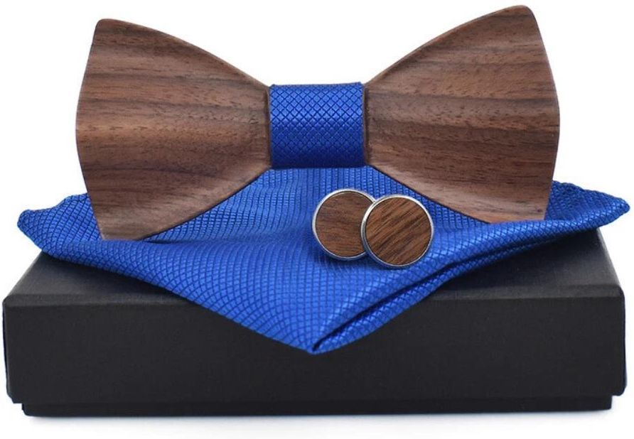 Mucha drewniana 3D z poszetką i spinkami do mankietu M162-138 granat Elegancka drewniana mucha z granatowym akcentem. W zestawie jest również poszetka w kolorze granatowym oraz spinki do mankietów drewniano stalowe. Całość zapakowana jest w eleganckie tekturowe opakowanie. Model: M162-139 Mucha materiał: drewno, kolor: brąz, wymiary: ok. 12cm x 5,5cm, zapięcie: regulowana gumka z zatrzaskiem. Poszetka (chustka) kolor: niebieski, wymiar: ok. 22cm x 22cm. Spinki do mankietu materiał: stal i drewno, wymiar: średnica ok. 20mm, kolor: brąz. Opakowanie: Eleganckie, tekturowe pudełko. Jest to naturalne drewno dlatego faktura i kolor może się różnić od zdjęcia głównego. Obok przedstawiamy przykładowe wzory.