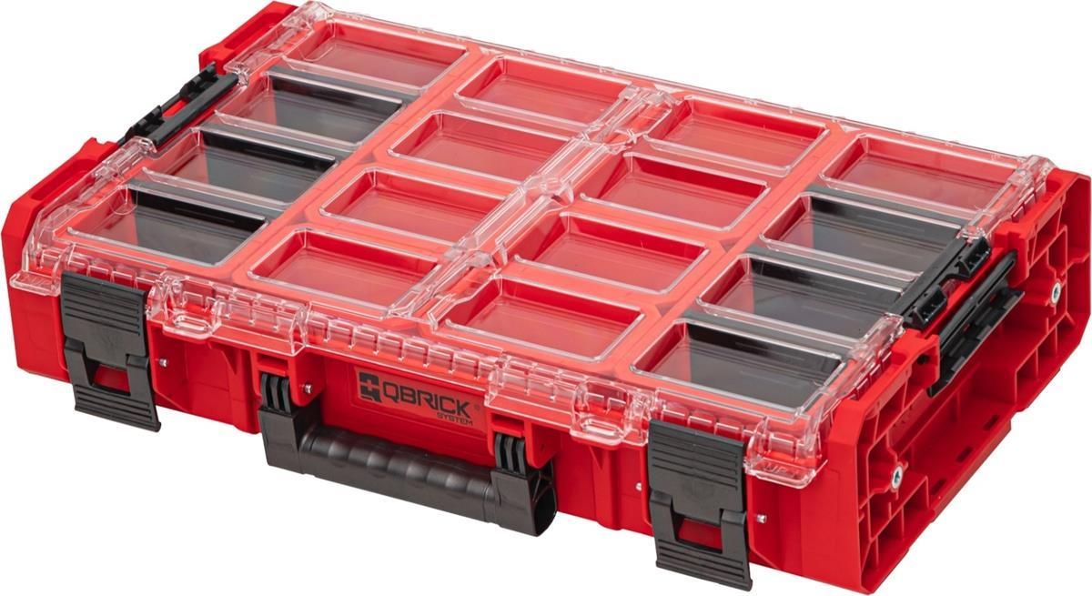 Skrzynia narzędziowa ONE Organizer XL 2.0 RED Ultra HD Custom, QBRICK SYSTEM [ORGQXL2CCZEPG001]: skrzynia narzędziowa - organizer do przechowywania i transportu narzędzi oraz akcesoriów, organizer należy do serii RED ULTRA HD - specjalnej edycji produktów Qbrick System ONE stworzonej z ultra-wytrzymałego tworzywa, które cechuje nadzwyczajna odporność na uszkodzenia mechaniczne, także w temperaturach poniżej 0 °C, wewnątrz skrzyni znajdują się dwa długie pojemniki o długości 30 cm z 3 wyjmowanymi przegródkami w każdym, dodatkowo w organizerze znajdują się 2 średnie i 4 małe wyjmowane pojemniki, poliwęglanowa pokrywa posiada litą uszczelkę, zapewniającą całkowitą ochronę przed wnikaniem pyłu oraz silnym strumieniem wody z każdej strony, opatentowane klamry zamykające zostały wykonane z tworzywa o zwiększonej odporności, ożebrowanie konstrukcji skrzyni zapewnia wysoką odporność na uszkodzenia mechaniczne, 4 inserty gwintowane w rozmiarze M8 pozwalają na indywidualną personalizację skrzyni pod potrzeby użytkownika, system zatrzasków bocznych pozwala na łączenie kilku skrzyń systemowych, skrzynia posiada 1 składany uchwyt do przenoszenia. PARAMETRY TECHNICZNE SKRZYNI ONE ORGANIZER RED ULTRA HD CUSTOM, QBRICK SYSTEM [ORGQXL2CCZEPG001]: pojemność: 13,5 L, norma szczelności: IP66, przekątna: 679 mm, wymiary wewnętrzne (D x S x W): 519 x 305 x 97 mm, wymiary zewnętrzne (D x S x W): 585 x 387 x 131 mm