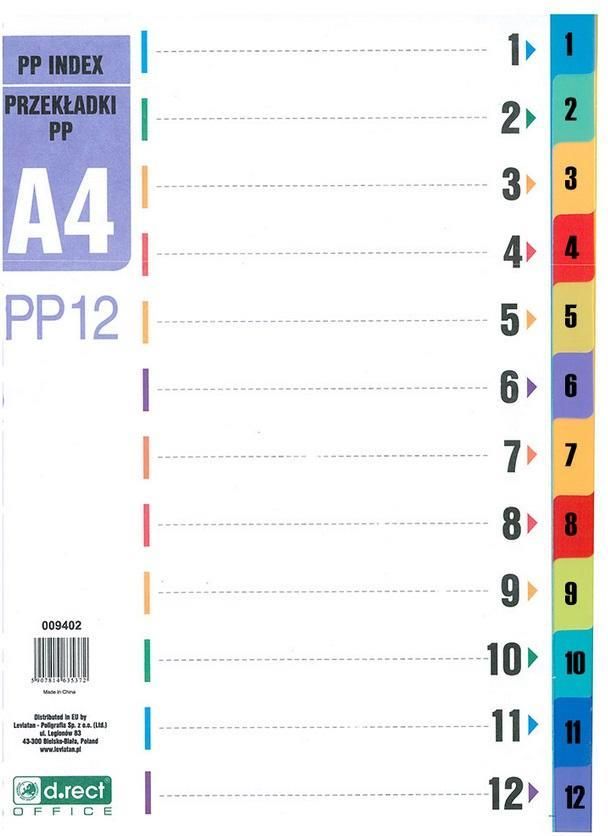 - przekładki PP ułatwiające segregowanie dokumentów - uniwersalna perforacja umożliwia wpięcie do każdego rodzaju segregatora - 12 przekładek: 1 - 12 - rozmiar A4