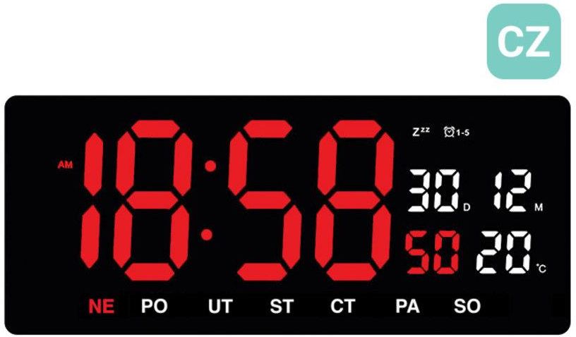 Zegar ścienny budzik sieciowy z czerwonymi cyframi LED i termometrem. Długość 36 cm. Cyfry 10 cm. Alarm / budzik. Duży budzik zegar stołowy szafkowy do biura pokoju salonu. Dni tygodnia w języku czeskim