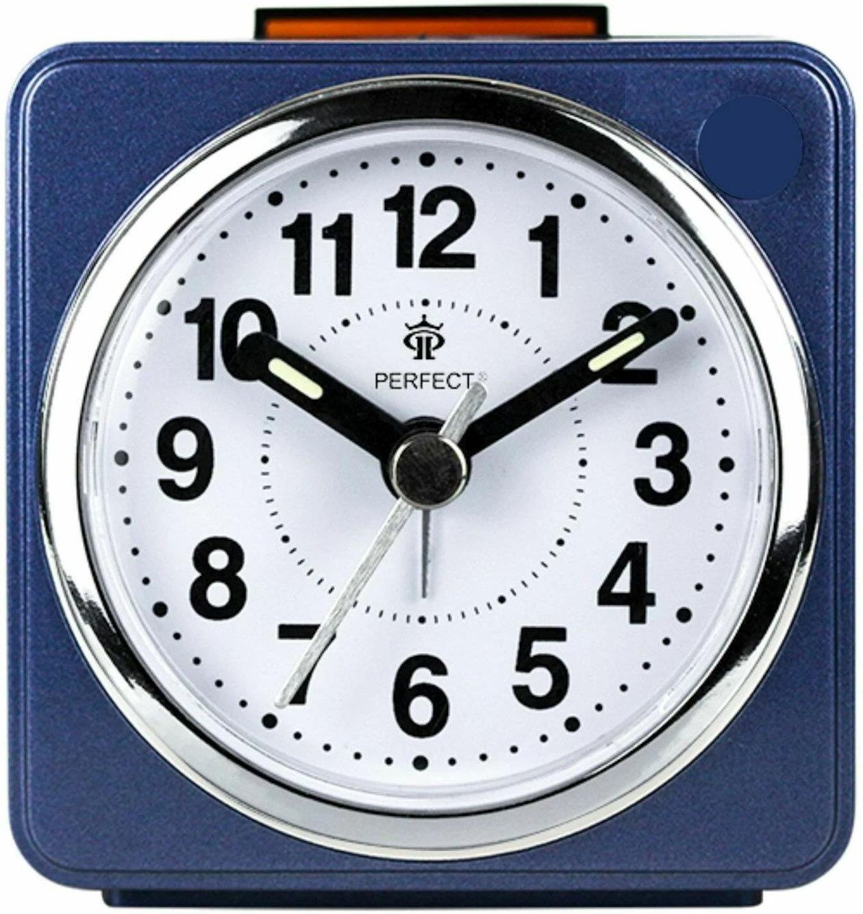 Niebieski granatowy mały czytelny kwadratowy podświetlany budzik kwarcowy Perfect BB06602. Budzenie dźwiękiem narastającym. Funkcja drzemki. Podświetlana tarcza. Mechanizm kwarcowy cichy. Mały klasyczny nieduży budzik do sypialni