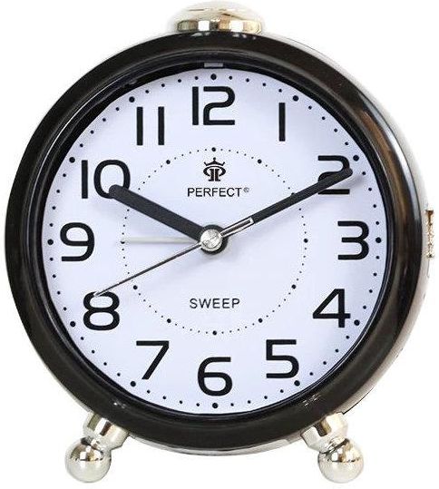 Średni czytelny podświetlany czarny okrągły budzik kwarcowy z wyraźnymi cyframi Perfect BB08902. Budzenie dźwiękiem narastającym, funkcja drzemki. Dokładny mechanizm kwarcowy. Czytelny i wyraźny budzik do sypialni, pokoju