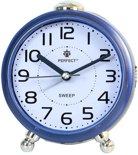 Średni czytelny podświetlany niebieski okrągły budzik kwarcowy z wyraźnymi cyframi Perfect BB08902. Budzenie dźwiękiem narastającym, funkcja drzemki. Dokładny mechanizm kwarcowy. Czytelny i wyraźny budzik do sypialni, pokoju