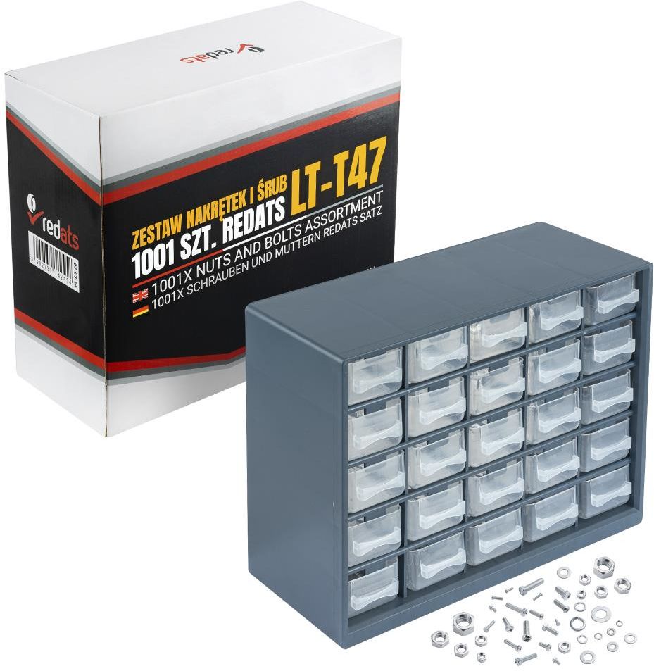 ZESTAW NAKRĘTEK I ŚRUB 1001SZT REDATS Producent: REDATS Rozmiary: M3, M4, M5, M6, M8 Liczba sztuk: 1001 sztuk Śruby: łeb sześciokątny/kulisty Nakrętki Podkładki: płaskie, sprężynowe Zawartość W tym zestawie znajdziesz dokładnie 1001 sztuk śrub i nakrętek. W poręcznym opakowaniu są śruby o rozmiarach M3-M8 , podkładki płaskie i sprężynowe. Praktyczne opakowanie Te śruby i nakrętki zapakowane są w praktyczną obudowę - z dedykowanymi przegródkami na każdy element. Łatwo znajdziesz konkretny element! Jakość REDATS! Wybierając REDATS kupujesz od oficjalnego dystrybutora urządzeń tej marki w Polsce i Europie. Urządzenia REDATS produkowane są w wiodących fabrykach tego rodzaju sprzętu, więc o standardy wykonania czy użyte części nie musisz się bać. Dystrybutor narzędzi i maszyn REDATS to firma funkcjonująca z sukcesami na polskim i międzynarodowym rynku od 2006. To uznany podmiot, który zdobył zaufanie już ponad 500 000 odbiorców. Kupując maszyny REDATS możesz liczyć na fachowe i kompleksowe wsparcie na każdym etapie zakupu czy użytkowania sprzętu. Galeria produktu: