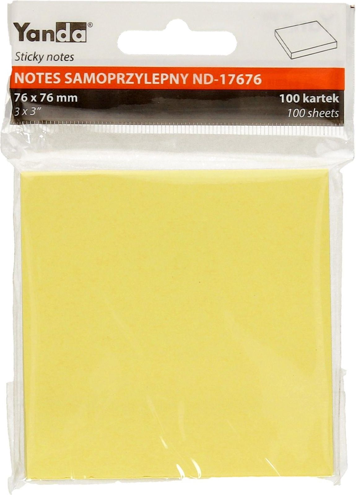 Karteczki samoprzylepne Yanda. Wymiary: 76 x 76 mm Kolor: zółty Ilość: 100 Karteczki z paskiem samoprzylepnym Odpowiedni klej pozwala na odklejanie bez pozostałości