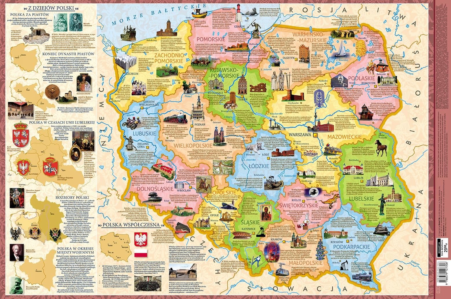Polska Regiony - podkładka na biurko (55x36,5 cm) Czas na kolejną podróż palcem po mapie! To świetna pomoc w opanowaniu nazw województw i ich stolic, zapamiętaniu relacji wielkości i położenia ich siebie oraz w odniesieniu do Morza Bałtyckiego i granic z sąsiednimi państwami. W każdym województwie umieszczono obrazki z opisami wybranych zabytków lub atrakcji turystycznych. Podkładka zawiera także informacje o historii Polski, pokazuje jak granice naszego państwa zmieniały się na przestrzeni wieków, pozwala porównać powierzchnię Polski w kluczowych momentach jej historii.