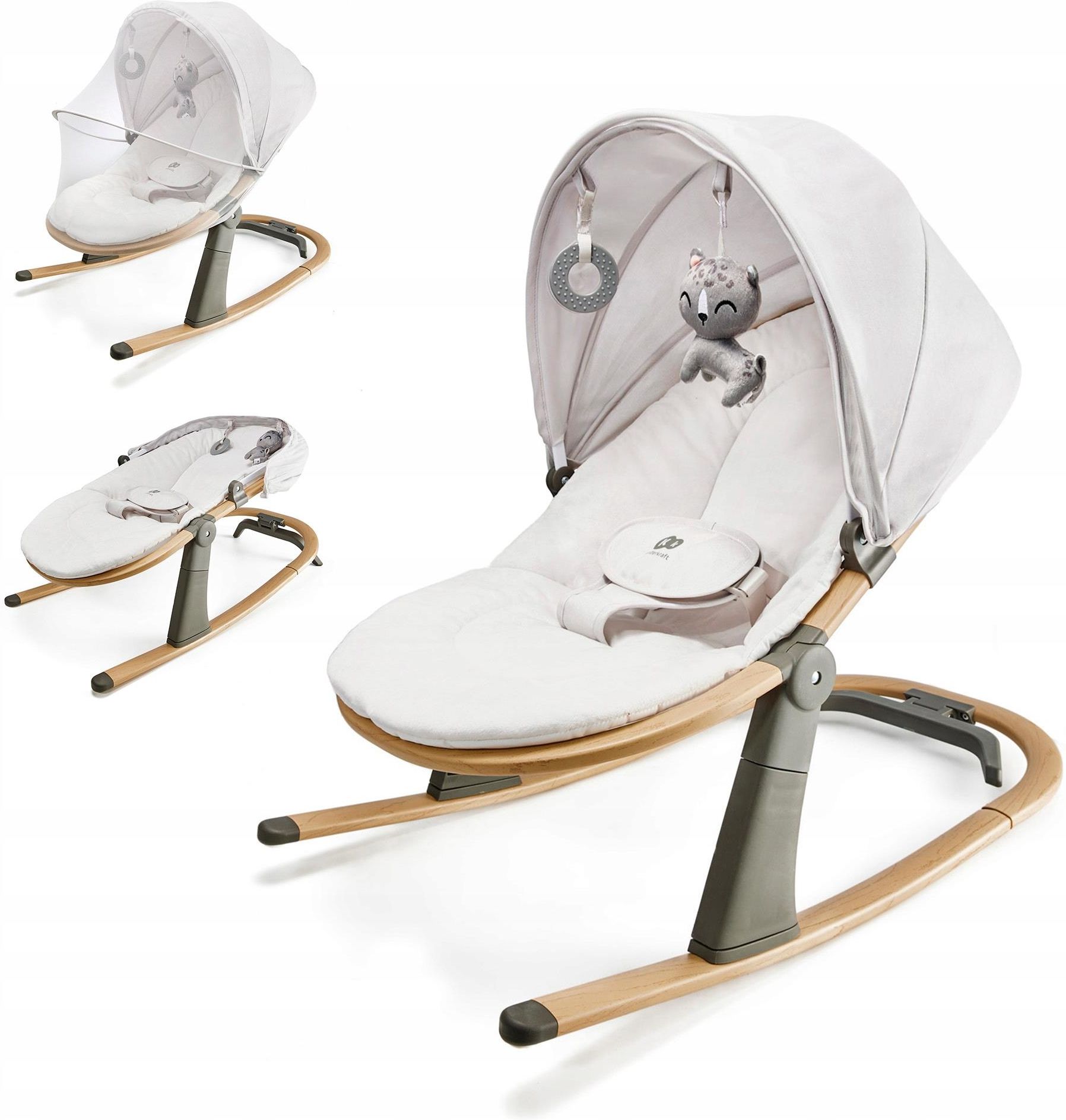 Bujaczek-leżaczek ELSU Kinderkraft 2w1: ELSU to połączenie bujaczka i leżaczka. 3 pozycje regulacji oparcia, blokada bujania. Miękkie, przytulne siedzisko otula dziecko jak ramiona rodzica. Jest bardzo łatwe w czyszczeniu. 3-punktowe pasy oraz stabilna konstrukcja zapewniają bezpieczeństwo dziecku podczas bujania i leżakowania. Zabawki aktywizujące dziecko w postaci pluszaka i gryzaka pomogą rozwijać wyobraźnię i motorykę. Daszek z moskitierą zapewni odpoczynek i komfortową zabawę nawet na dworze. Lekkość konstrukcji pozwala na swobodne przenoszenie. Neutralne kolory i elegancki design wkomponuje się do różnorodnych wnętrz. Leżaczek i bujaczek w jednym produkcie Funkcja 2w1 pozwala wykorzystać ELSU zarówno jako leżaczek, jak i bujaczek. Prosta blokada bujania pozwala jednym ruchem zmienić ELSU w leżaczek. To ogromny komfort i wsparcie dla rodziców, którzy zyskują chwilę wytchnienia i możliwość zajęcia się relaksem bądź innymi codziennymi obowiązkami. 3 pozycje regulacji oparcia Szukałeś perfekcyjnego prezentu z okazji narodzin dziecka? Oto ELSU! Nowoczesny design i bezpieczeństwo konstrukcji to połączenie estetyki i funkcjonalności w jednym produkcie. 3 pozycje regulacji oparcia sprawiają, że bujaczek ELSU przeznaczony jest zarówno dla noworodków, jak i dzieci do 9 kg. Bezpieczeństwo: pasy i trwała konstrukcja Niektóre dzieci od narodzin są niezwykle spokojne, a inne to prawdziwe wiercipięty. Bujaczek-leżaczek ELSU został wyposażony w 3-punktowe pasy, które w pełni zabezpieczą malca. Ich konstrukcja została tak dopasowana do dzieci, by zapewnić wygodę odpoczynku i jednocześnie zagwarantować bezpieczeństwo. ELSU ma trwały, aluminiowy stelaż, który czyni go łatwym w przenoszeniu. Jest niezwykle lekki — waży tylko 2,5 kg. Twoja pociecha znajdzie się w przytulnym, bezpiecznym bujaczku, a Ty będziesz mieć chwilę dla siebie. Zabawki aktywizujące dziecko Rozwój wyobraźni i zdolności motorycznych to bardzo ważny element w życiu każdego dziecka. Dlatego ELSU posiada dwie zabawki, które ten rozwój wspomogą — mięciutką maskotkę oraz gryzak. Sprawia to, że bujaczek-leżaczek 2w1 ELSU to idealne miejsce do drzemki, odpoczynku jak i zabawy malca. Daszek z moskitierą Zabierz swoją pociechę na dwór i pokaż jej kawałek świata. Daszek z moskitierą ochroni dziecko przed słońcem oraz owadami, gwarantując mu pełne bezpieczeństwo. Malec będzie mógł bawić się i odpoczywać w komfortowym leżaczku i jednocześnie oddychać świeżym powietrzem. To doskonały pomysł na wspólne spędzenie czasu poza domem i budowanie relacji z rodziną. Siedzisko, które otula miękkością Dzieci jak nikt inny potrzebują bliskości. ELSU to nowoczesny design, który nie tylko elegancko prezentuje się w domowym zaciszu, ale również gwarantuje wygodę dla malca. Starannie dobrany do bujaczka materiał jest przyjemny w dotyku, a odpowiednia miękkość otula niczym ramiona rodzica. Wiemy, jak ważna jest higiena, dlatego siedzisko zostało skonstruowane tak, by było łatwe do czyszczenia. Jego poszycie w każdej chwili możesz ściągnąć i wyprać. Uniwersalny, klasyczny design Stworzyliśmy bujaczek ELSU z myślą o estetyce wnętrz. Jego uniwersalny, klasyczny design sprawia, że doda uroku każdemu wnętrzu. Dodatkowo neutralne kolory stanowią miłe dla oka odejście od kolorowych i pstrokatych zabawek dziecięcych. ELSU to estetyka, która uspokaja. Wprowadza do przestrzeni harmonię i stanowi elegancki element wystroju. Będzie pasował zarówno do salonu, sypialni jak i pokoju dziecięcego. Specyfikacja Materiały Stelaż: aluminium Siedzisko, poduszka: 100% poliester Moskitiera, zabawki: crystal super soft, poliester Wymiary Maksymalna wysokość: 65 cm Maksymalna długość: 75,5 cm Waga: 2,5kg Waga maksymalna (z dodatkami): 3,3 kg
