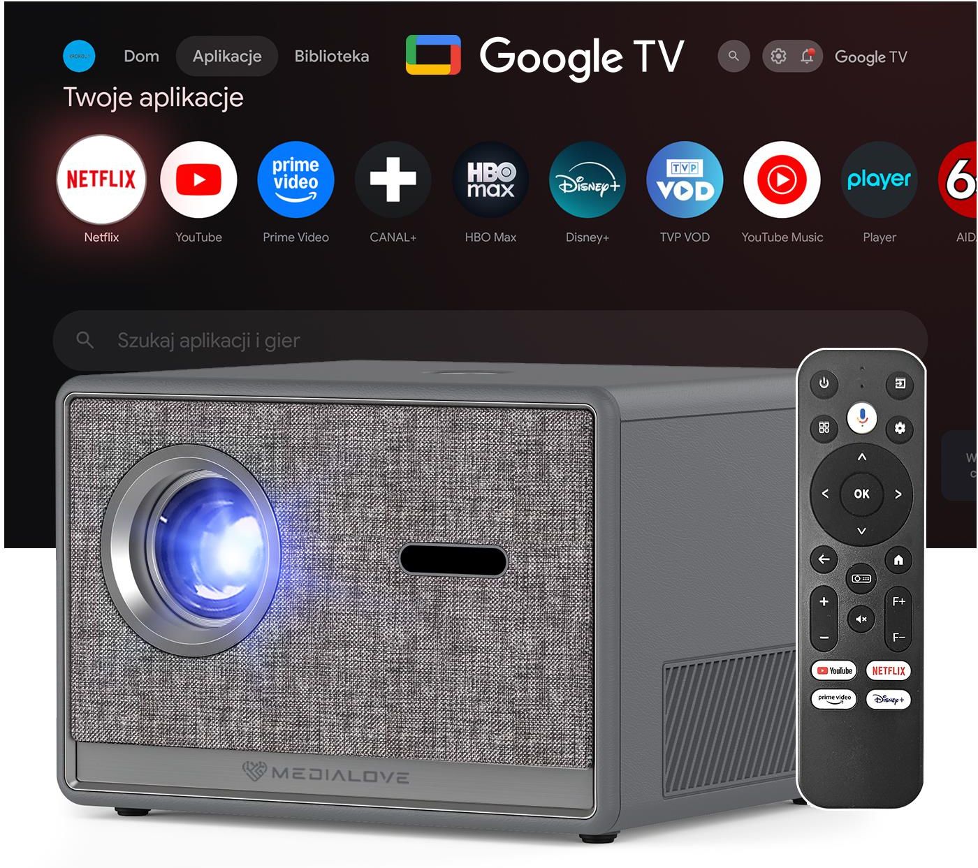 Projektor Medialove M1000 GTV Rzutnik LED Autofocus GoogleTV 11 4K Full HD Jeśli nie lubisz niespodzianek to zamiast projektorów z mocno okrojonym Androidem i aplikacjami bez wsparcia wybierz stabilny i oficjalny system Google TV. To nowsza i bardziej intuicyjna wersja systemu Android TV, oferująca te same funkcje, ale w jeszcze wygodniejszej formie: szybki dostęp do ulubionych aplikacji, rekomendacje filmów i seriali, sterowanie głosowe Asystentem Google. W praktyce: Google TV = Android TV nowej generacji. A więc jeśli szukasz projektora z Android TV, ten model spełni wszystkie Twoje oczekiwania. Odkryj kino Domowe wraz z projektorem LED Medialove M1000 GTV Google TV 11 + AF Oficjalny system operacyjnym Google TV (opartym na Android TV) (bezpośrednio z urządzenia możesz odtwarzać filmy na Youtube, Netflix, HBO, Disney+, Prime Video, Skyshowtime i wiele innych bez potrzeby podłączania się do urządzenia przez telefon, laptopa, itp.) Pilot z Asystentem Google oraz skrótami do Youtube, Netflix, Disney+ oraz Prime Video. Wifi ze wsparciem Airplay / Chromecast / Airscreen (do udostępniana obrazu z telefonu) Bluetooth 5.1 ⭐ AUTO FOCUS + Auto Keystone (Autokorekcja obrazu) + TOF* 1000 ANSI lm / 30000 lumenów ZAMKNIĘTA KONSTRUKCJA OPTYKI PROJEKTORA (koniec z kurzem na ekranie) Bardzo cichy! 40dB - realna zmierzona wartość. * Dzięki technologii TOF projektor jeszcze szybciej i dokładniej ustawia ostrość oraz automatycznie koryguje zniekształcenia obrazu (keystone), zapewniając jeszcze lepszy obraz w stosunku do tradycyjnego autofocusa. Projektor LED Medialove M1000 GTV Google TV + AF Urządzenie, które zaoferuje Ci niesamowite doznania wizualne i dźwiękowe. Posiada rozdzielczość natywną Full HD (1920px x 1080px), działa na systemie Google TV, obsługuje WiFi oraz Bluetooth 5.1. Z jasnością 1000 ANSI lumenów i kontrastem 2000:1 gwarantuje wysoką jakość obrazu.✅ Szybki dostęp do aplikacji do przesyłania strumieniowego z telefonów z systemem Android i iOs: dzięki funkcji Chromecast, czy innych dostępnych aplikacji łatwo przerzucisz obraz z telefonu na projektor. W zestawie znajdziesz pilot.✅ Lekka konstrukcja, kompaktowe rozmiary i wbudowane gniazda USB, HDMI oraz AUX sprawiają, że projektor jest łatwy do przenoszenia i używania. Projektor z zamkniętą optyką!!! Większość projektorów posiada otwartą optyką, przez co mogą pojawiać się plamy kurzu widoczne na obrazie. WSZYSTKO W JEDNYM MIEJSCU DZIĘKI SYSTEMOWI OPERACYJNEMU GoogleTV Wbudowane aplikacje to YouTube, Netflix, Prime Video, czy Disney+. Zainstalujesz na urządzeniu ze sklepu Google Play np. HBO Max, SkyShowtime, Premiery Canal+, Polsat Box Go, Kodi, TVP VOD, TVN24 Go, Viaplay, TV Smart Go, CDA Smart TV, TVP Sports, Eleven Sports PL, Ekstraklasa TV, UPC TV Go, Spotify i wiele, wiele innych. Znajdź czas na twój relaks i rozrywkę! DLACZEGO WYBRAĆ WŁAŚNIE TEN PROJEKTOR? Obraz do 200 cali w rozdzielczości Full HD (1080p)✅ Zamknięta konstrukcja, dzięki takiej budowie nie musimy martwić się o kurz czy inne zanieczyszczenia na ekranie✅ Oficjalny system Google TV 11 (opartym na Android TV)- aktualizacje większości aplikacji na bieżąco✅ Łączność Wi-Fi 2,4Ghz / 5Ghz ze wsparciem Chromecast✅ Aż 60 000 godzin żywotności lampy✅ HDR✅ Kontrast 2000:1✅ Jasność 1000 ANSI lumenów / 30000 light source lm✅ Automatyczne ustawienie ostrości i korekcja trapezoidu✅ Łączność za pomocą Wi-Fi z urządzeniami w systemach Android, iOS laptopami z Windows!✅ Możliwość zawieszenia pod sufitem lub na statywie✅ Funkcja ZOOM✅ Prostota użytkowania✅ Wbudowane głośniki 2 x 5W HiFi 3D Stereo ✅ Sterowanie za pomocą pilota, wyszukiwanie głosowe✅ Wbudowane aplikacje: YouTube, Netflix, Prime Video, sklep Google Play (tysiące aplikacji do pobrania)✅ Wejścia: USB, HDMI, AUX, IR✅ W podstawie gwint na statyw oraz otwory do standardowego uchwytu sufitowego (pod gumowymi nóżkami) Co oferuje projektor M1000 GTV? MediaLove M1000 GTV to przenośny projektor LED, który zamieni każdy pokój w salę kinową. Dzięki systemowi Google TV 11 otrzymujesz dostęp do platform streamingowych, aplikacji i gier bez konieczności podłączania dodatkowych urządzeń. AUTOMATYCZNE USTAWIENIE OSTROŚCI PRZY ROZRUCHU - AUTO FOCUS Rzutnik został wyposażony w aparat o wysokiej czułości, który skutecznie automatycznie się wyostrza, poprawiając jakoś obrazu.✅ Jakość obrazu może być również ustawiona ręcznie za pomocą pilota. ŚWIETNY OBRAZ DZIĘKI AUTO FOCUS I KEYSTONE CORRECTION Czy znasz to uczucie, gdy próbujesz dostosować obraz projektora i marnujesz na to mnóstwo czasu? Z Projektor Medialove, ten problem zniknie raz na zawsze. Dzięki funkcji Auto Focus i Keystone Correction Twój obraz zostanie automatycznie wyjustowany do ostrości i odpowiednich proporcji. Wszystko to w kilka sekund. Zapomnij o manualnych regulacjach, zapomnij o zniekształceniu obrazu. Po prostu włącz projektor i ciesz się perfekcyjnym obrazem. FUNKCJA ZOOM 50% -100% Dzięki tej innowacyjnej funkcji nie ma potrzeby częstego dostosowywania odległości projektora do rozmiaru ekranu.✅ Jeżeli obraz jest za duży i nie ma możliwości przestawienia projektora wystarczy łączyć opcje zoom i zmniejszyć obraz. Można zmniejszyć obrazu z 100%, aż do 50%. JASNOŚĆ 1000 ANSI LUMENS I RODZIELCZOŚĆ 1080p DLA NIEZRÓWNANEJ JAKOŚCI OBRAZU Jeżeli jakość obrazu jest dla Ciebie priorytetem, Projektor Medialove zostanie Twoim nowym najlepszym przyjacielem. Oferuje on jasność na poziomie 1000 ANSI Lumens i rozdzielczość 1080p, co gwarantuje wyjątkowo jasny i ostry obraz, niezależnie od warunków oświetleniowych. Oglądaj filmy, prowadź prezentacje, czy graj w gry wideo w jakości, jakiej nigdy wcześniej nie doświadczyłeś. M1000 GTV przekształci każdą przestrzeń w prywatne kino z niezrównaną jakością obrazu. Jakie ma funkcje? Sprzęt wyposażony jest 